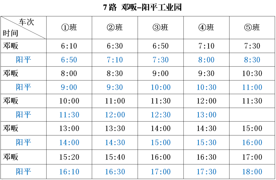 7路 邓畈村—阳平工业园(本路线车辆往返站点相同)