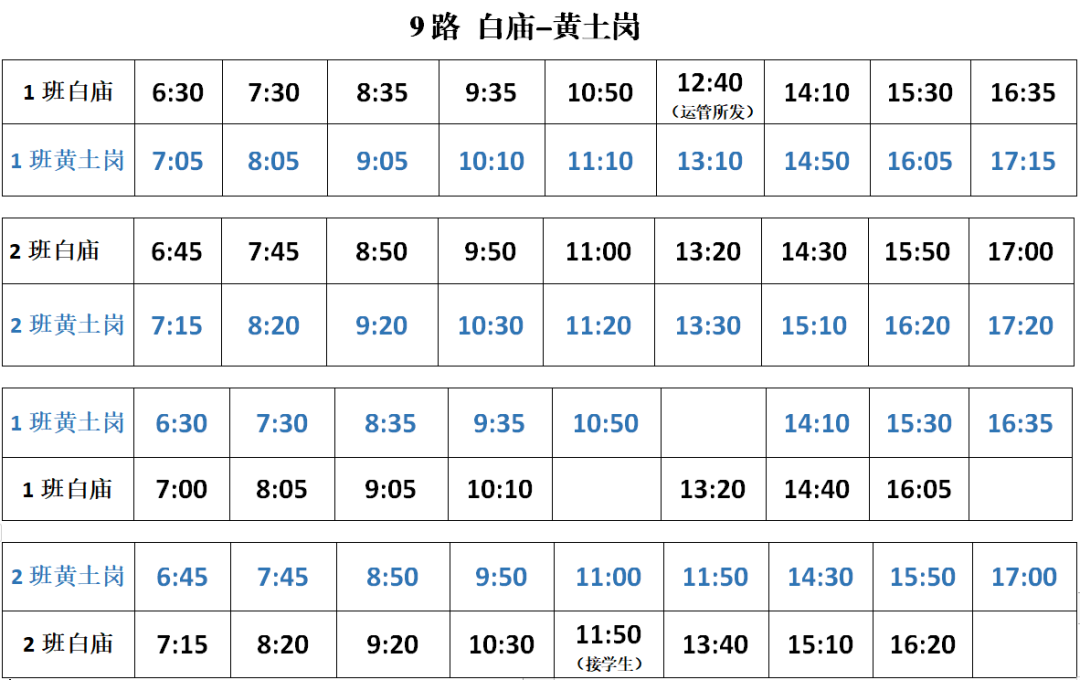 9路 白庙—黄土岗(本路线车辆往返站点相同)