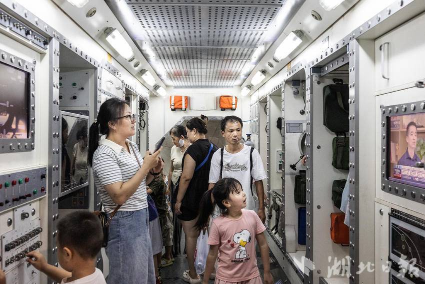 7月12日,在武汉市科技馆“月球空间”展区,不少家长带着小朋友参观五星红旗的登月同款、模拟月壤和中国空间站模型,探索登月奥秘。