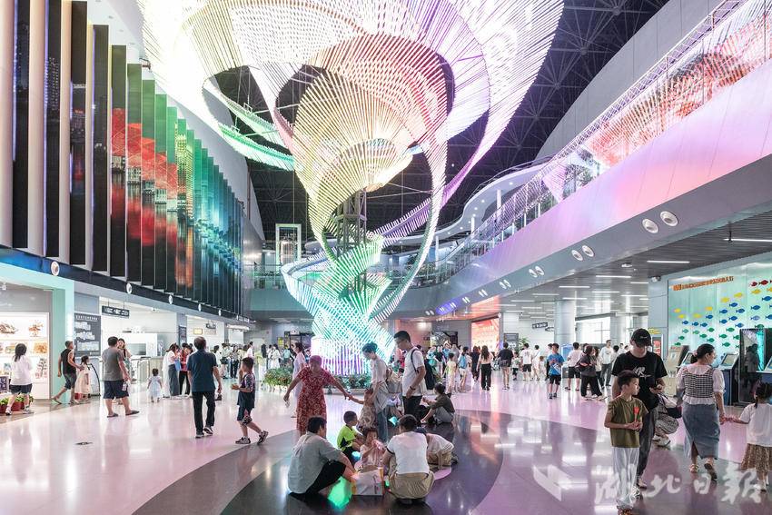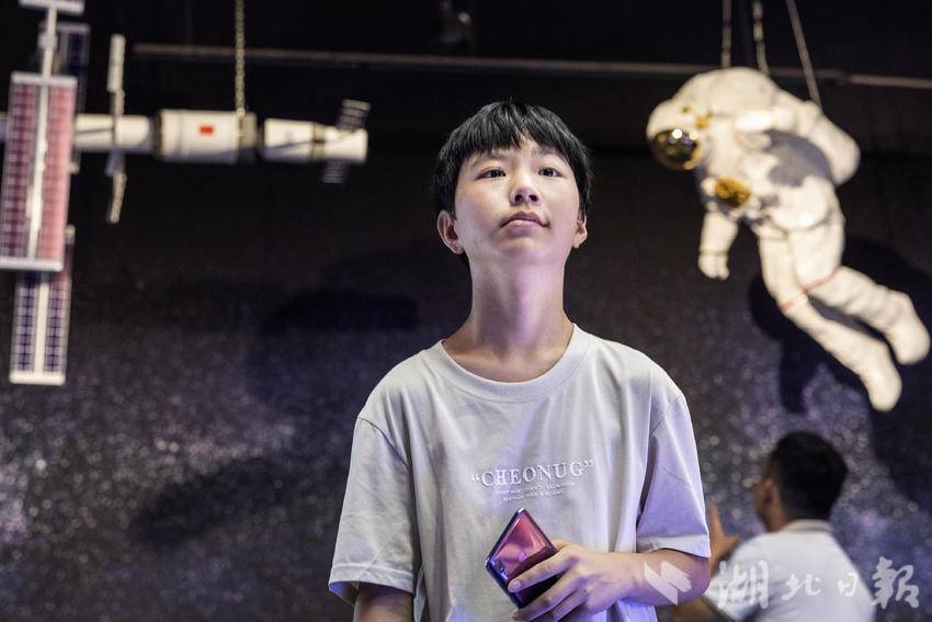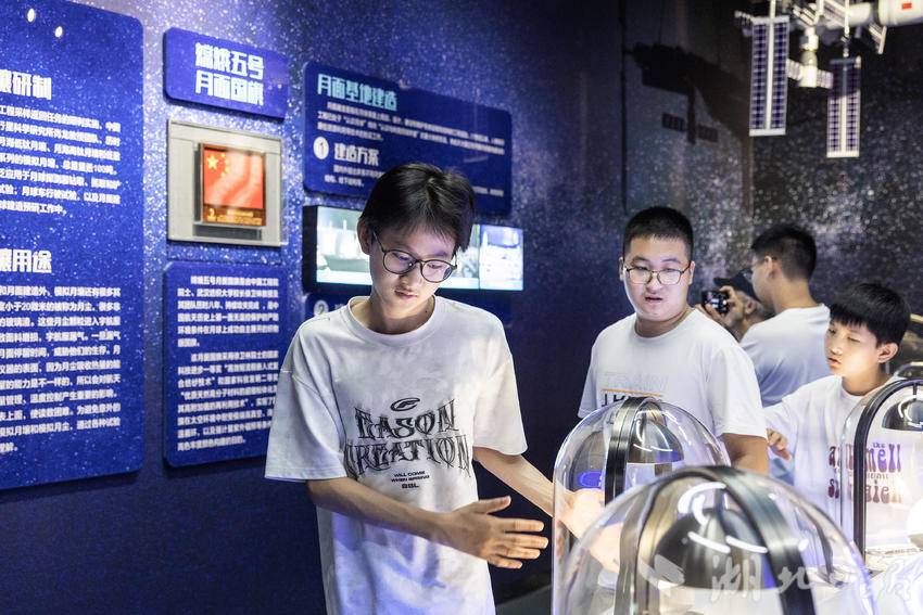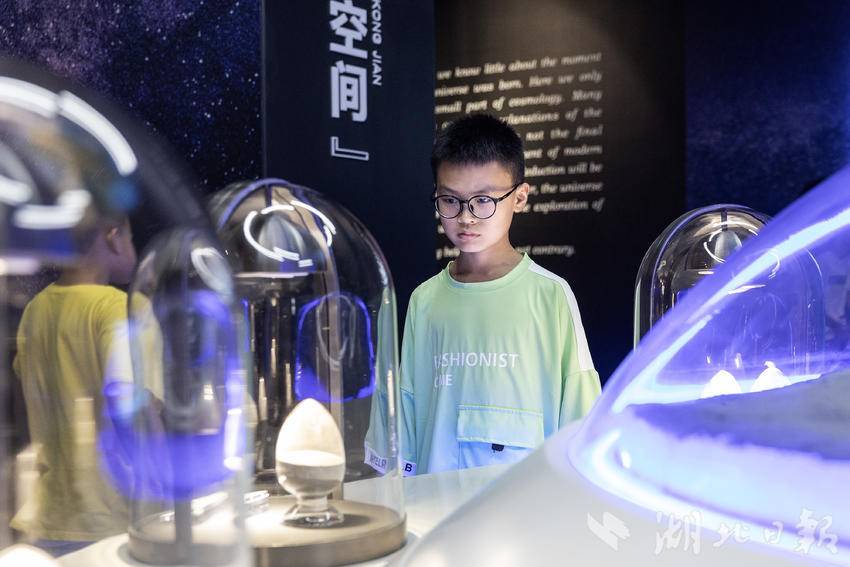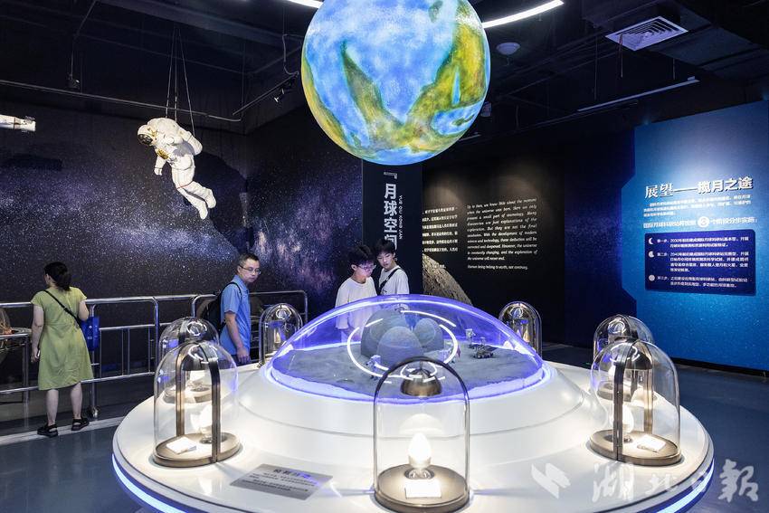 近日,在中小学生暑假到来之际,武汉科学技术馆时隔109天后恢复开放,每日限定8000名观众预约参观。在新增的“月球空间”展区,展出着中国地质大学肖龙教授团队提供的模拟月壤展品和武汉纺织大学徐卫林院士团队提供的月面国旗展品,帮助前来参观的中小学生们打开科学世界的大门。(湖北日报全媒记者任勇、通讯员胡彤、黄彦雄摄)