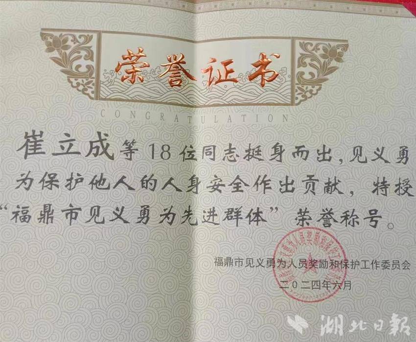 湖北日报讯(记者余宽宏 通讯员袁方、刘必忠)7月14从竹山县获悉,福建省福鼎市日前召开第十七次见义勇为先进个人(群体)表扬大会,隆重表扬了2022年以来涌现出来的21名见义勇为先进人物,并向受表彰的见义勇为先进个人(群体)颁发荣誉证书和奖金,竹山县5名见义勇为“平民英雄”名列其中。