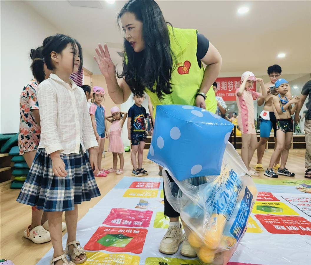 分组练习中,每个孩子都有机会在浅水区实践所学,教练们同步指导,确保安全的同时巩固技能。活动尾声,由社工陈雪晴设计的防溺水真人版飞行棋游戏成为亮点,孩子们在游戏中深化防溺水知识,寓教于乐,收获满满。