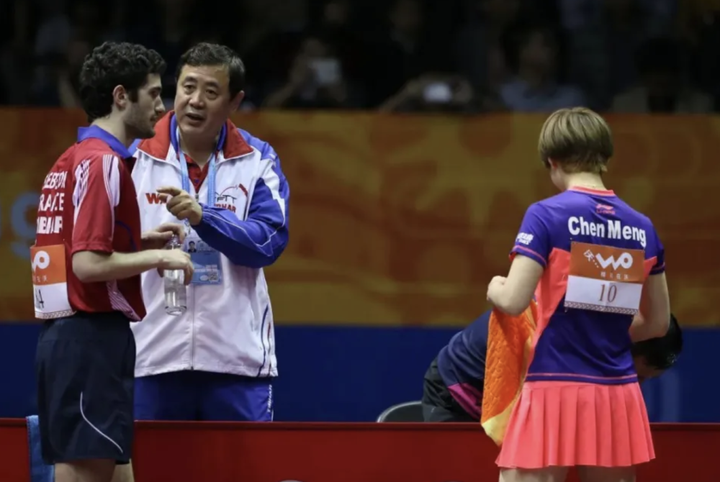 韩华(左二)为中法混双组合陈梦/莱贝松做场外指导