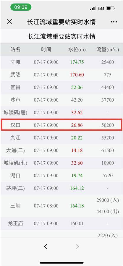 7月17日上午,记者查询长江水文网看到,截至当日上午9时,长江汉口站水位已达26.86米,再度接近警戒水位。