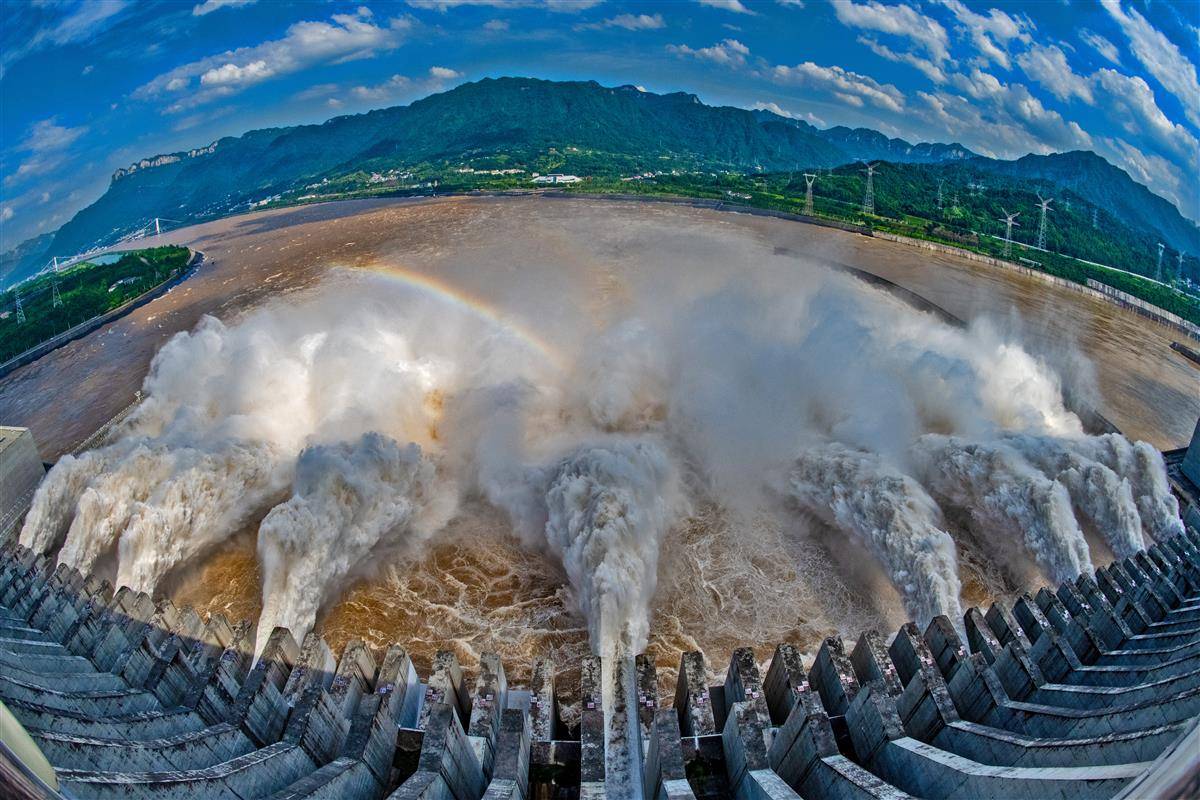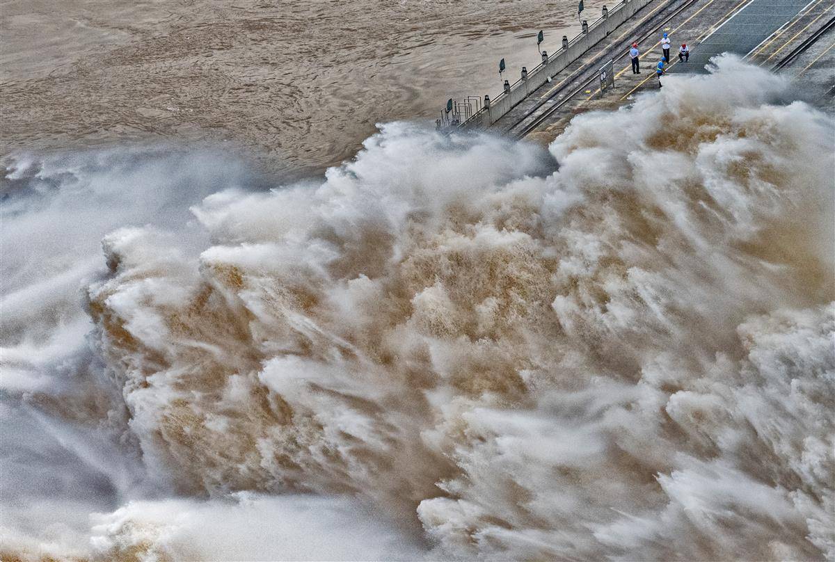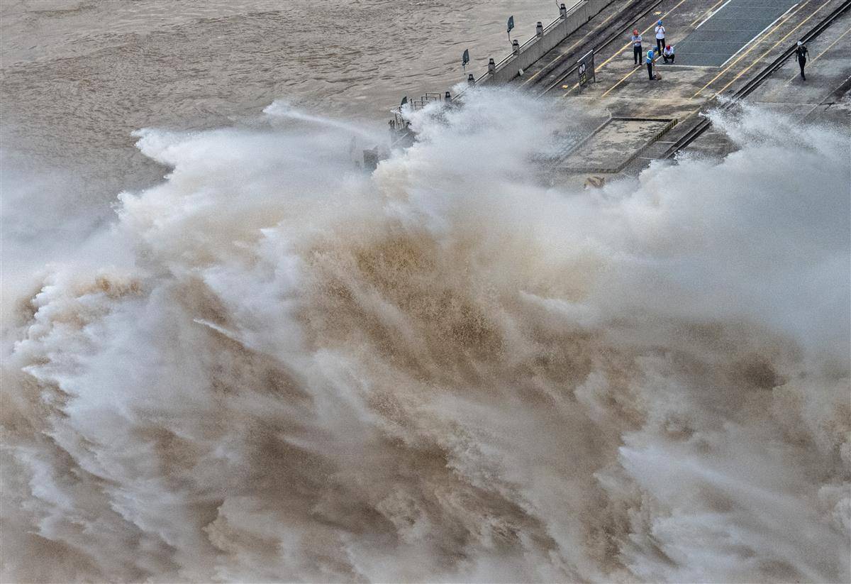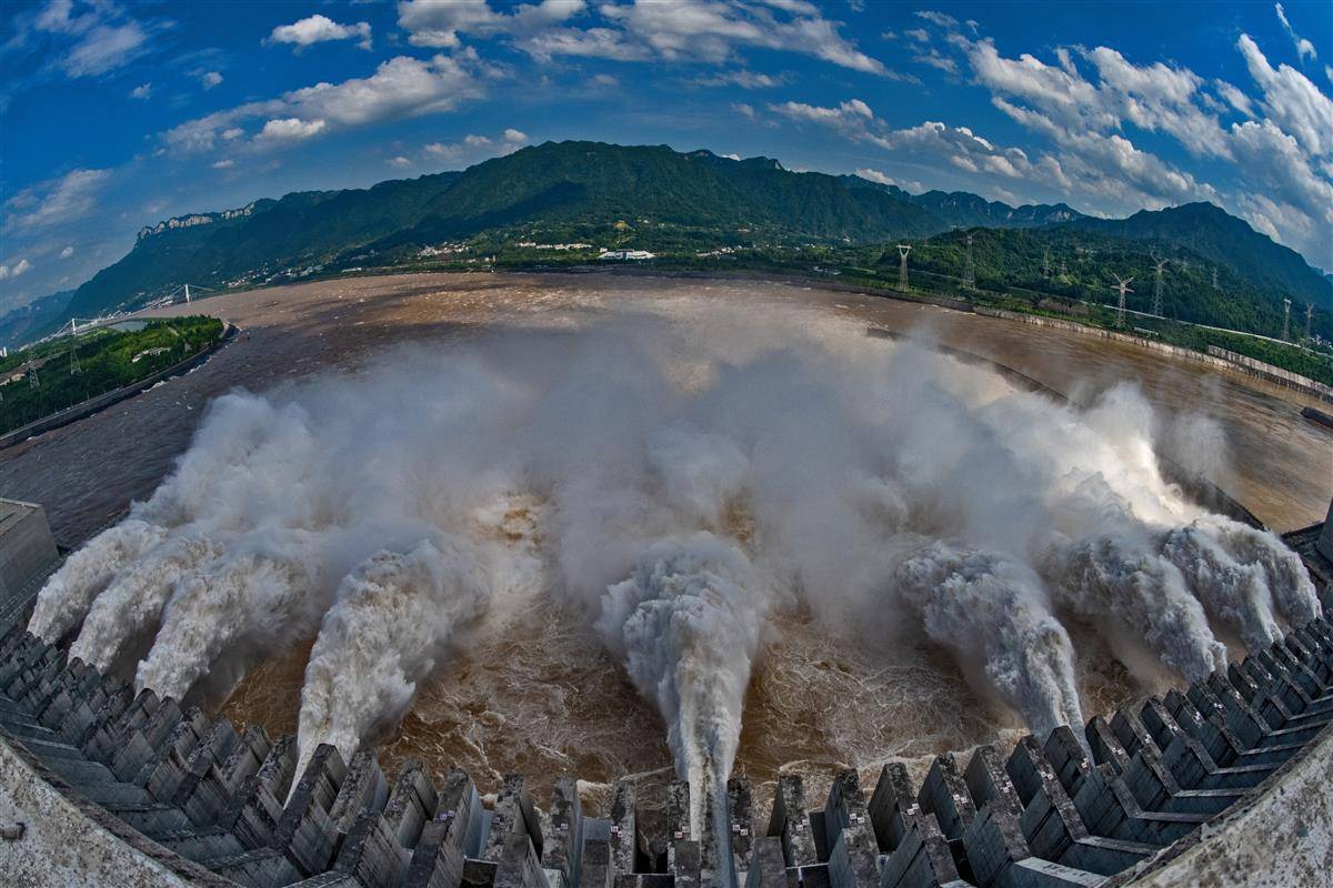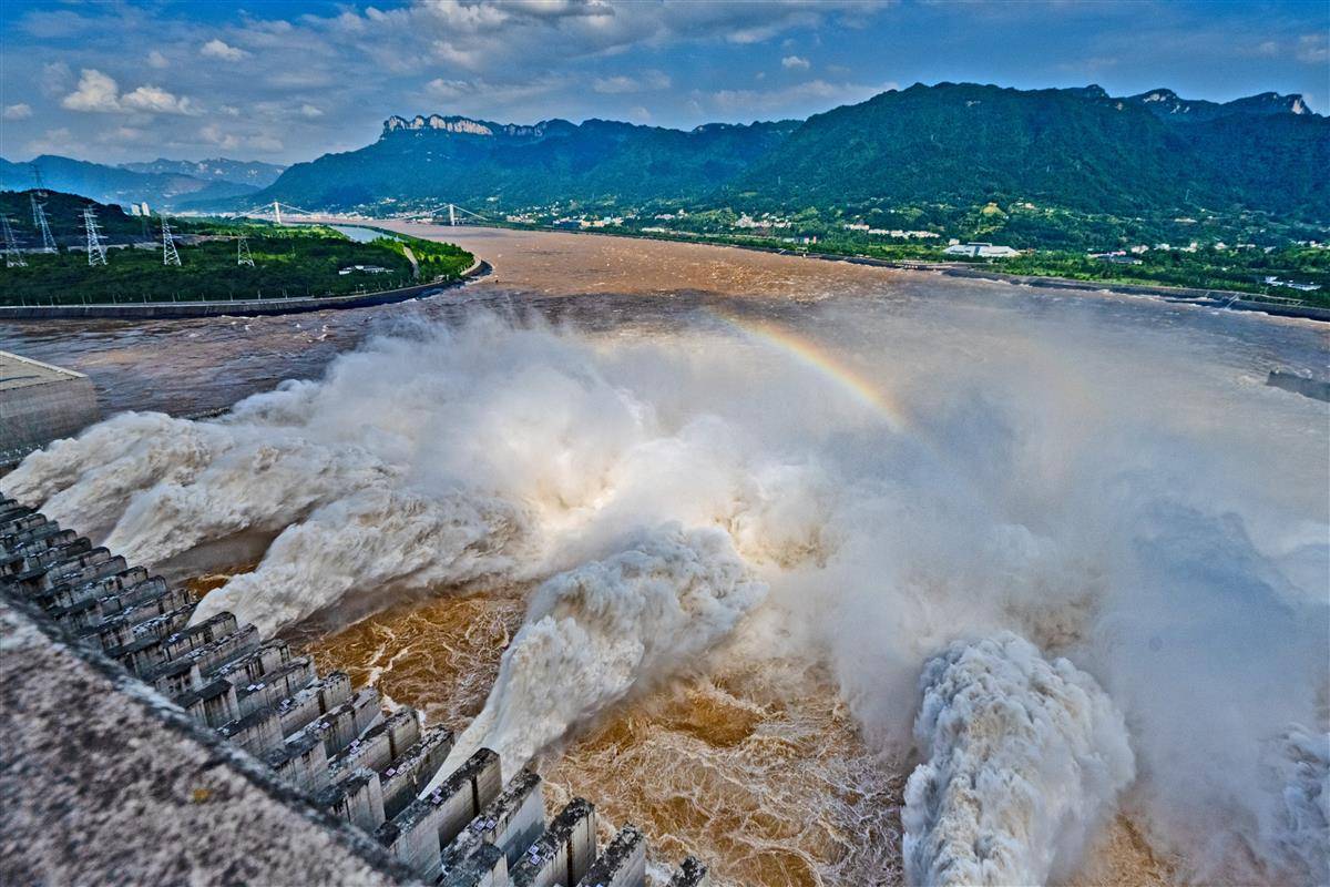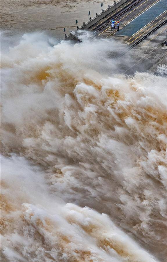 7月16日16时,记者在三峡大坝坝顶看到,9股巨大的“水龙”喷薄而出,三峡大坝依然维持9孔泄洪。16日16时,三峡出库流量43900立方米每秒,三峡水库水位164.91米。