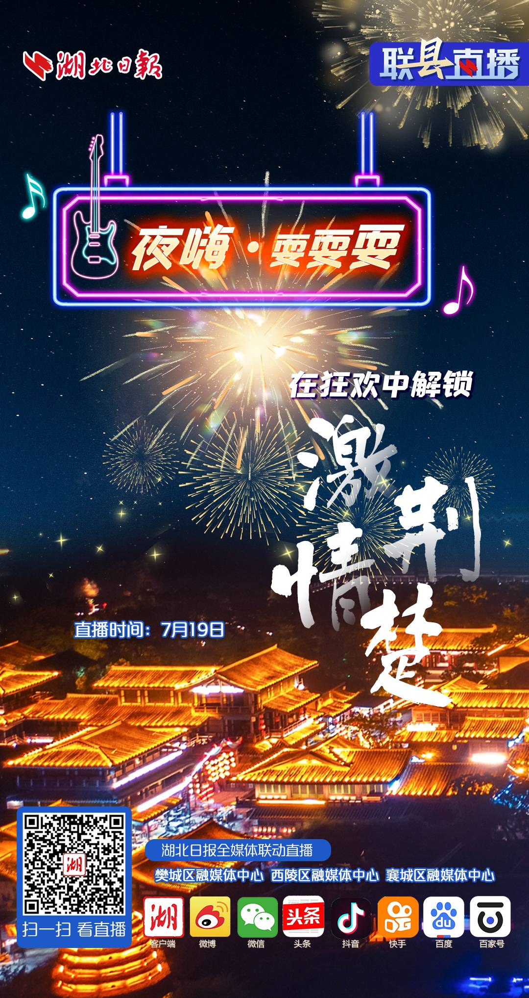 7月19日17:50,湖北日报特联动襄阳市樊城区、襄阳市襄城区、宜昌市西陵区开展“夜经济”系列直播第二期《夜嗨•耍耍耍 在狂欢中解锁激情荆楚》,届时,各区融媒记者将带着广大网友一起,云游“小范大人”走过的梦幻唐城,逛藏在街头的宝藏音乐市集,体验最嗨的篝火晚会,云解锁夏日狂欢新姿势。