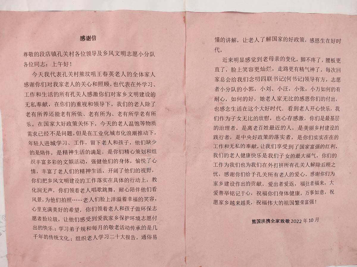 村民熊国洪看到母亲王春英的视频,给志愿者写来感谢信:“近来明显感觉老母亲的变化,脚不疼了,腰板更直了,笑容更灿烂了,走路更有精气神了。感谢你们为在外打拼的孔关人解除了后顾之忧。”