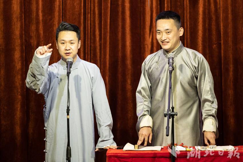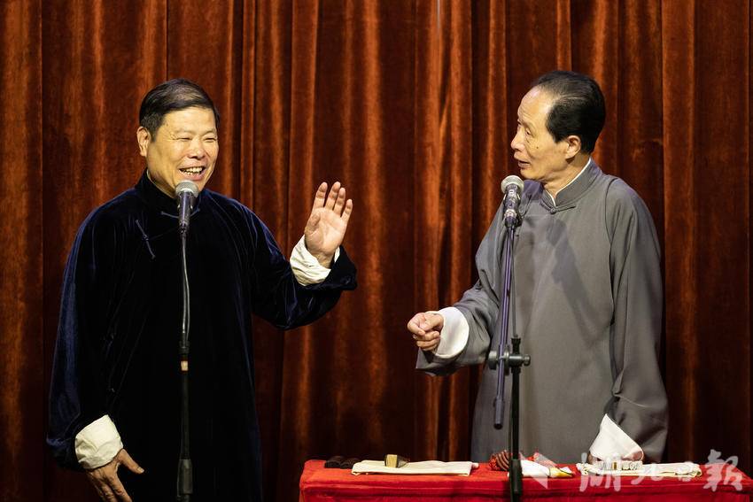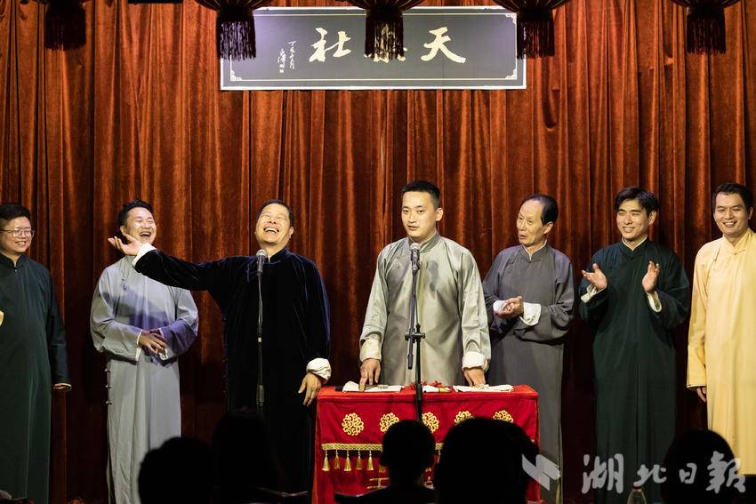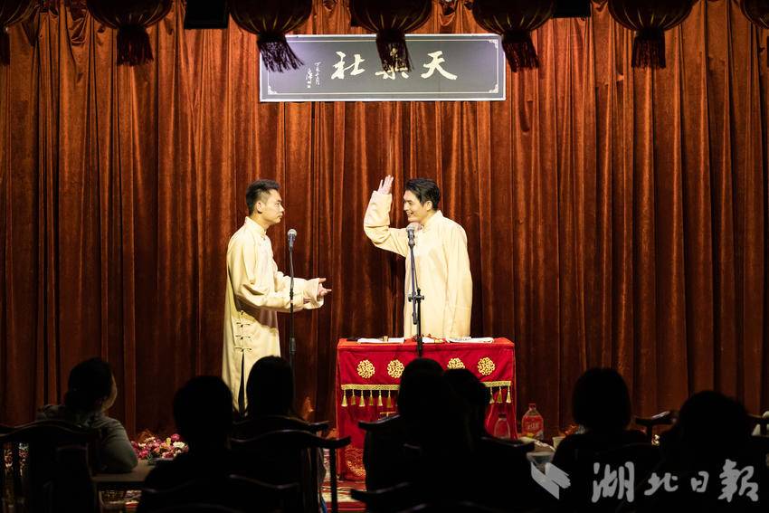 7月21日晚,在武汉相声茶馆天乐社,市民和游客们观看相声演出。一盘瓜子儿,咂盖碗儿茶,夏夜暑气正浓时,位于吉庆街的天乐社里欢笑声不断。作为武汉地道老牌相声团体,天乐社于2007年创办,妙趣横生的包袱和表演,已成为许多江城市民消暑的难忘记忆。(湖北日报全媒记者任勇摄)