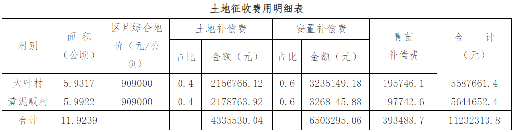 征收土地青苗补偿费、土地补偿费和安置补助费共计:11232313.8元,由庙岭镇政府直接支付给被征地村组。