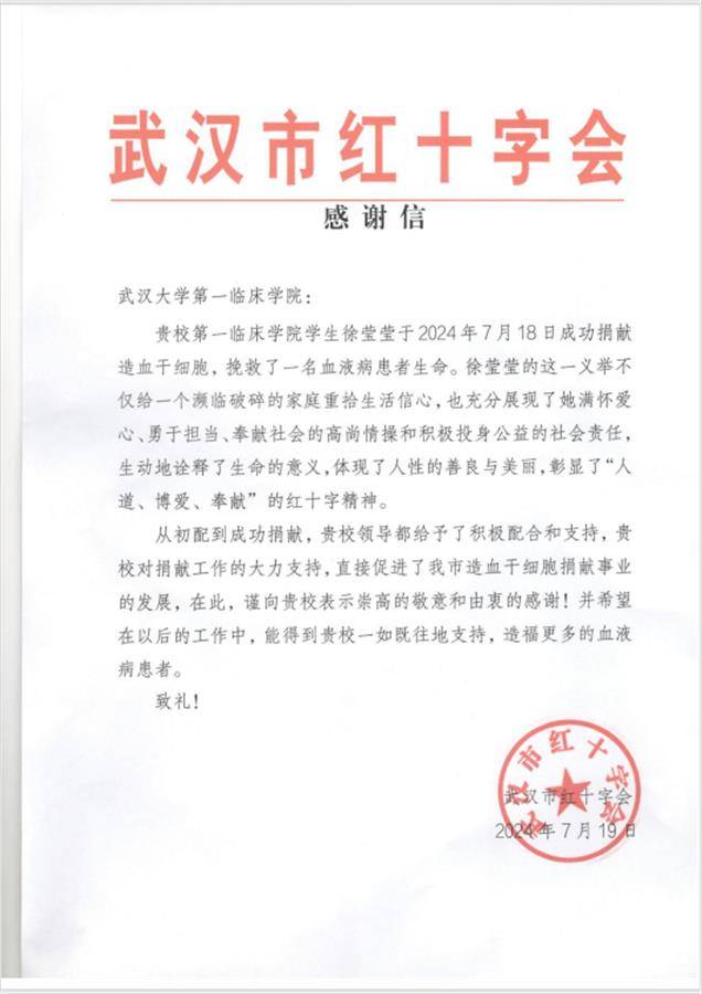 7月22日,武汉市红十字会向武汉大学人民医院发来感谢信,信中高度赞扬徐莹莹的高尚情操,同时对医院的大力支持表达崇高敬意和由衷感谢。武汉大学人民医院党委近期也对徐莹莹的先进事迹予以专题表彰和嘉奖,授予她“见义勇为好学生”称号。
