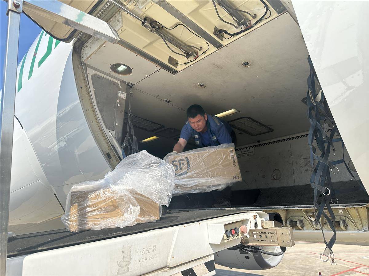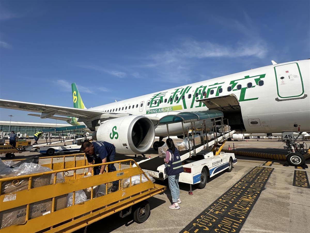 除乘客行李外,飞机货舱内还有305件快递包裹。经过30分钟卸载,它们被装在4台转运车上,送往仓库等待物流公司提取。