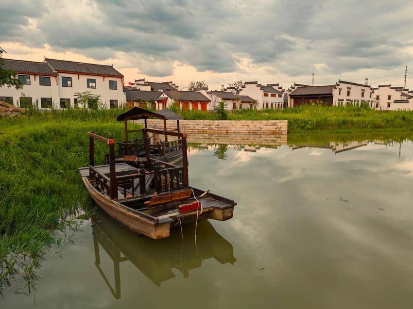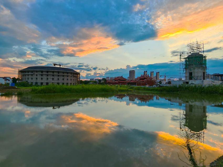 炎炎夏日,雨后傍晚的湖北省重点文旅项目“祥云湾”,天空湛蓝,白云朵朵,彩霞临空,古建古色古香,小桥小船悠悠,湖水白鹅绿树,白云彩霞辉映,游人流连忘返。