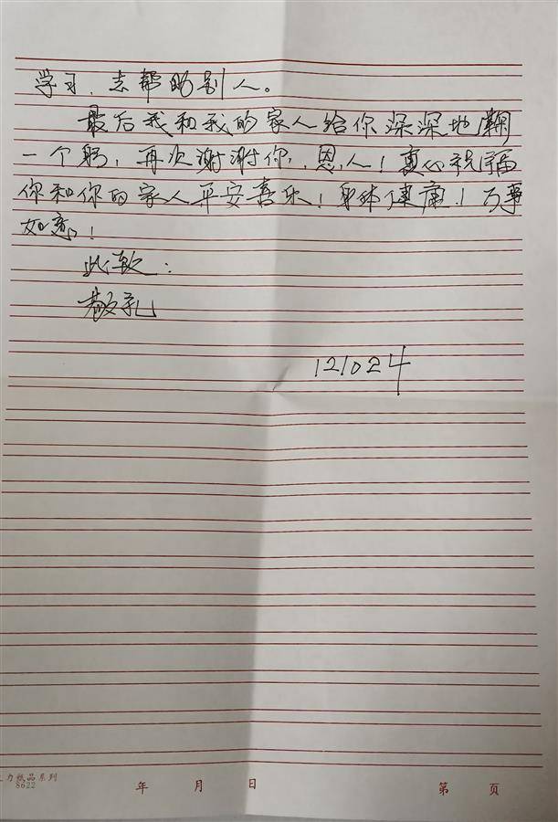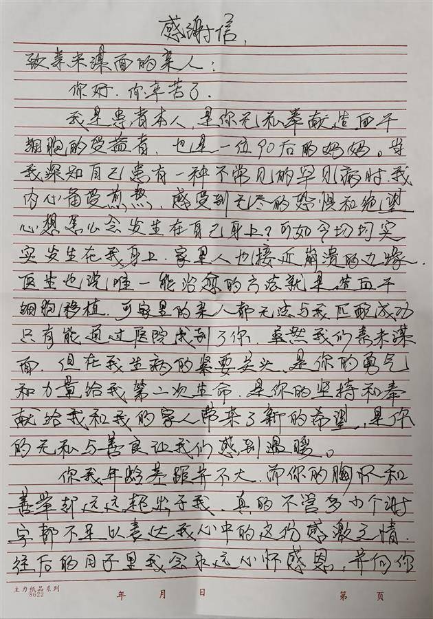 对于白血病患者小刘(化名)来说,是一个具有特殊意义的日子。这一天,她将接受造血干细胞的移植手术。她在感谢信里写道:“虽然我们素未谋面,但在我生病的紧要关头,是你的勇气和力量给了我第二次生命;是你的坚持和奉献给我和家人带来了新的希望;是你的无私与善良让我们感到温暖。”