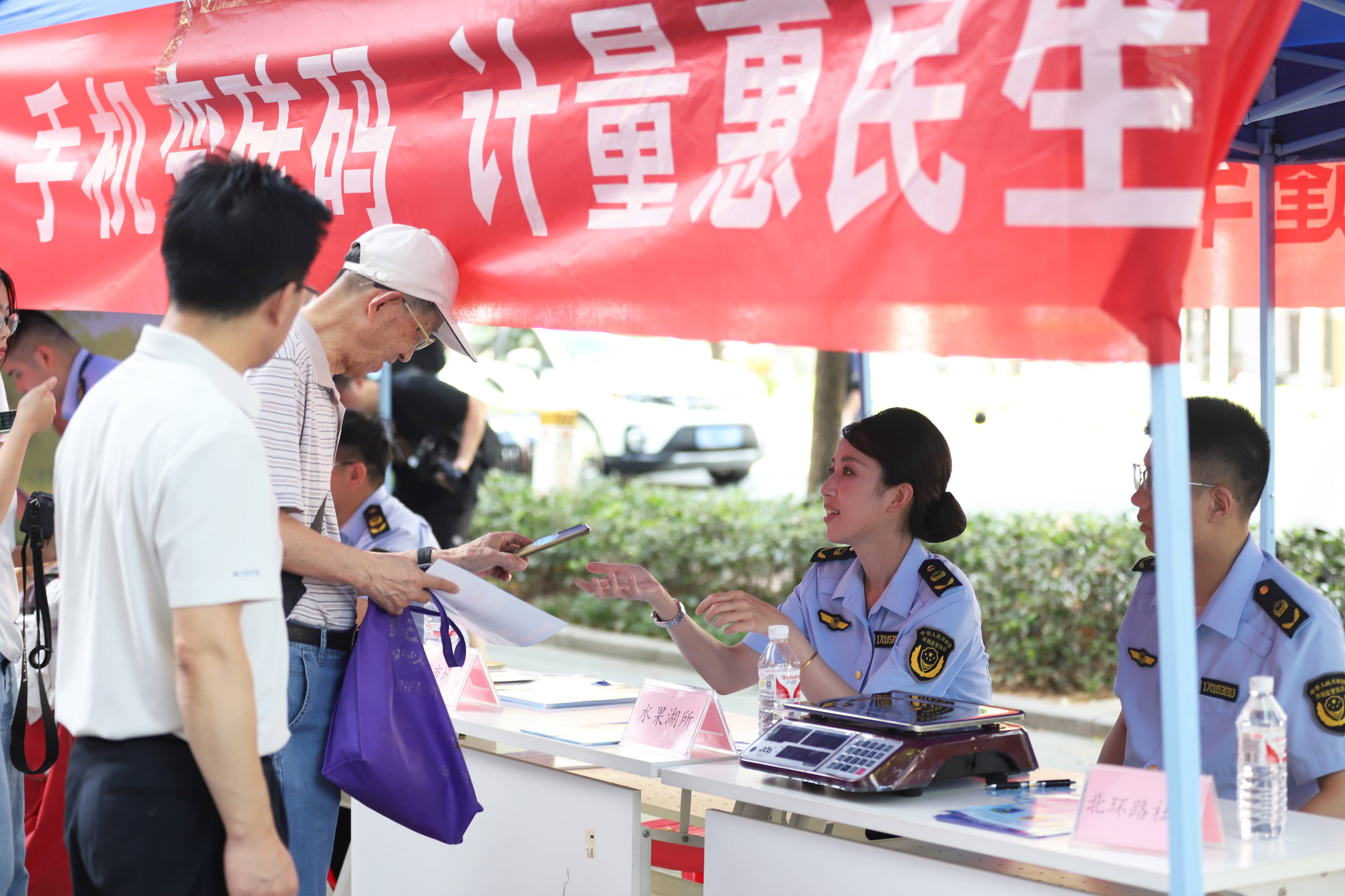 为营造良好的市场计量秩序,让老百姓买得放心,7月31日上午,省市场监管局联合武昌区市场监管局在武昌区水果湖街北环路社区开展“市场监管新闻大篷车 手机变砝码 计量惠民生”活动。