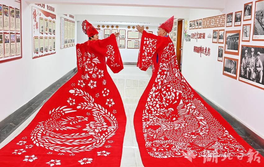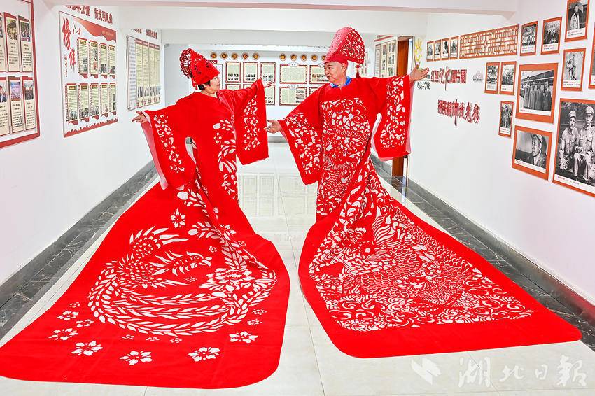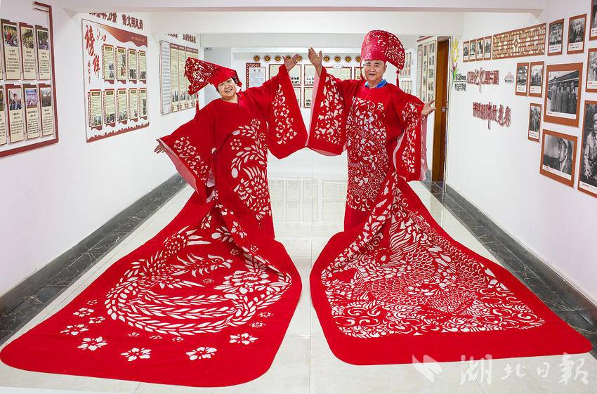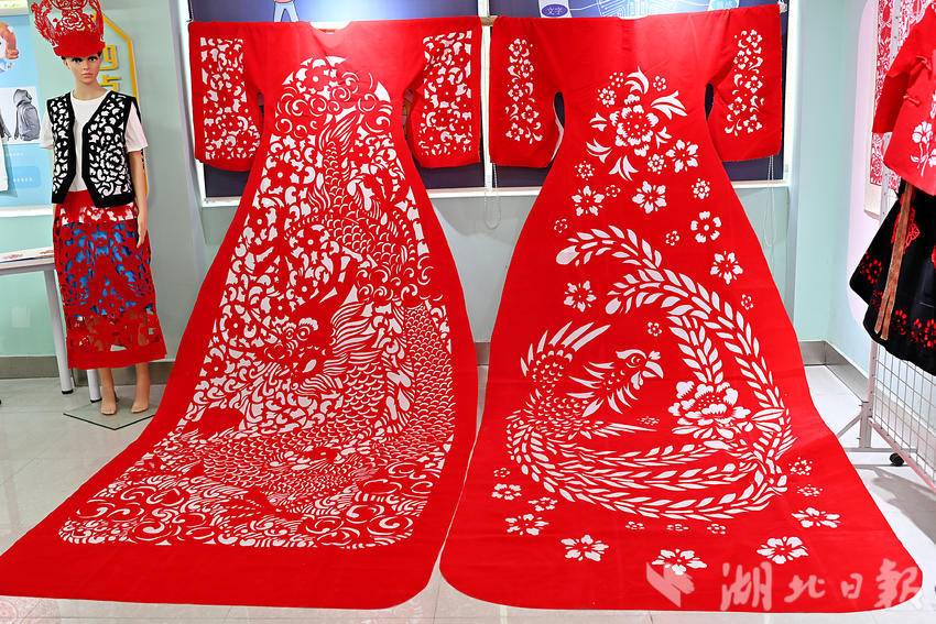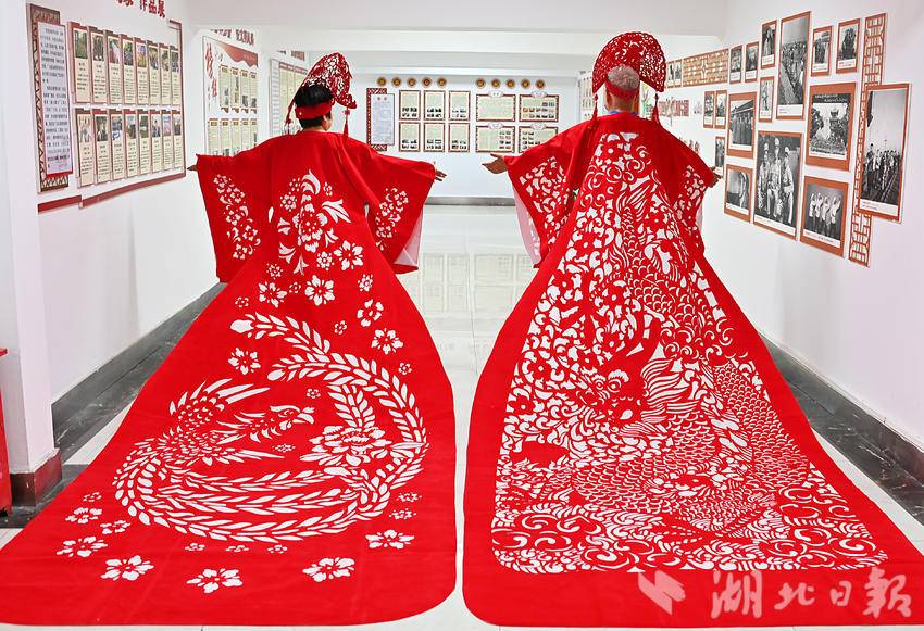 8月2日,一套龙凤袍剪纸服饰在武汉青山区123社区亮相,湖北省工艺美术大师、“武汉剪纸”市级非遗项目代表性传承人江先孝客串模特,身着龙袍展示中国非遗之美。这套龙凤袍由江先孝剪纸团队制作完成,长4米,采取了“武汉剪纸”的阴刻手法,融入龙、凤凰和梅花元素,耗时8天在植绒布上创作完成。(湖北日报全媒记者 朱熙勇 摄)