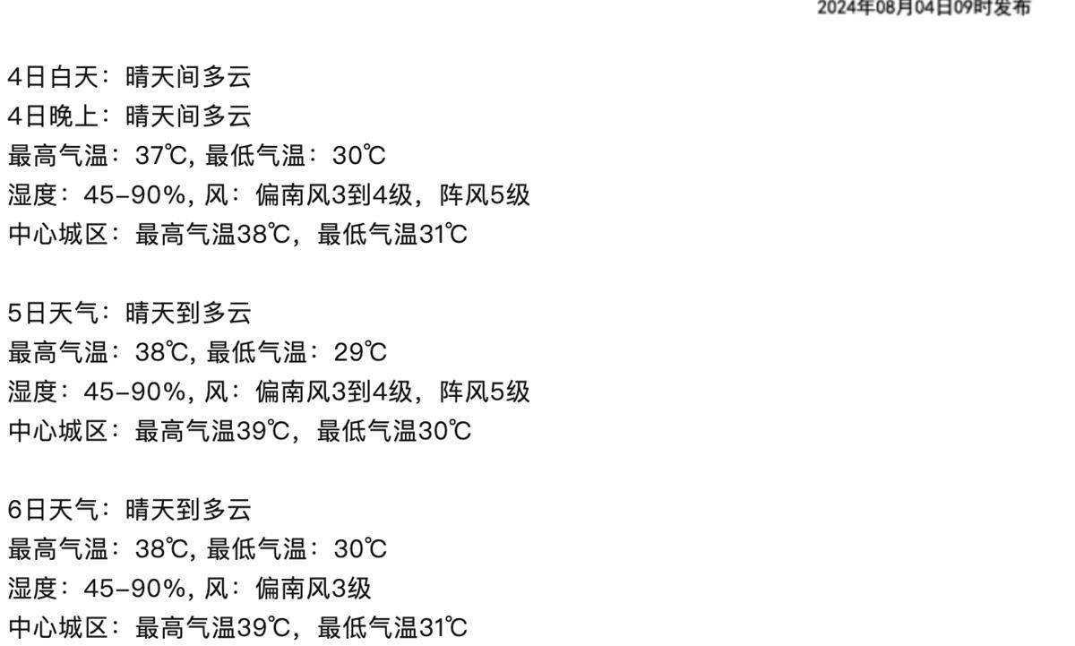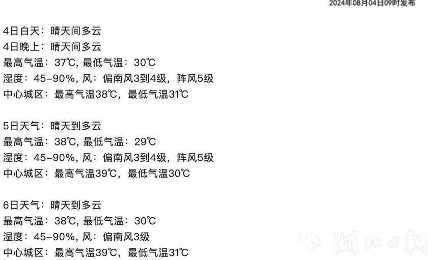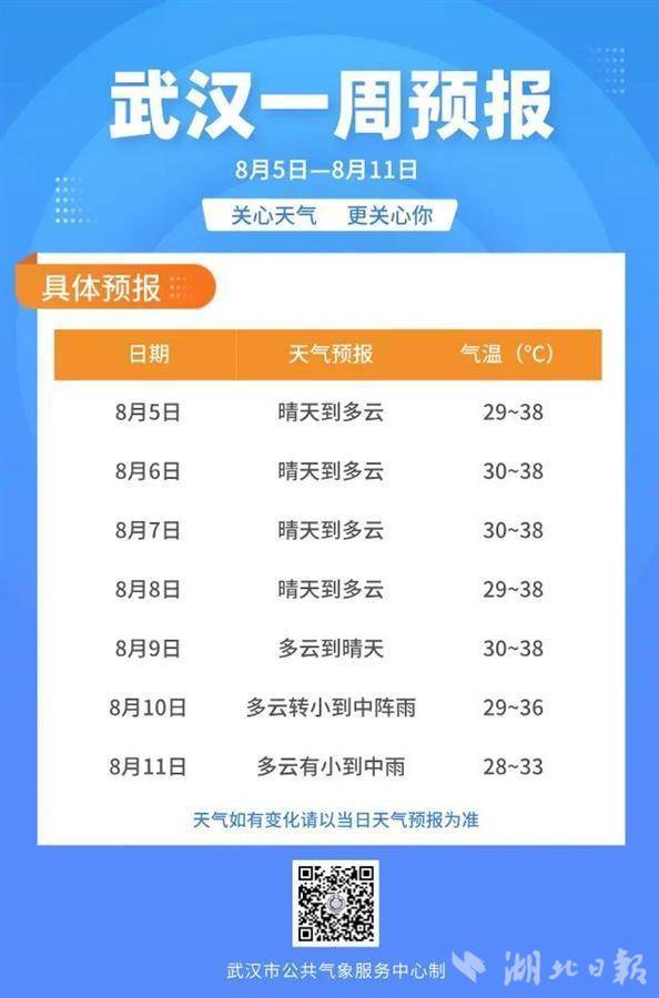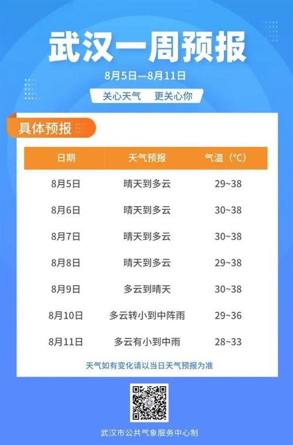 昨天武汉市晴天到多云,大部地区最低气温28℃~30℃,最高气温36℃~38℃。今天早晨武汉市晴天间多云,大部地区最低气温27℃~30℃。预计4日至9日,受副热带高压控制,武汉市继续晴热高温天气;10日至11日,受高空波动和中低层切变共同影响,武汉市有降水发生。
