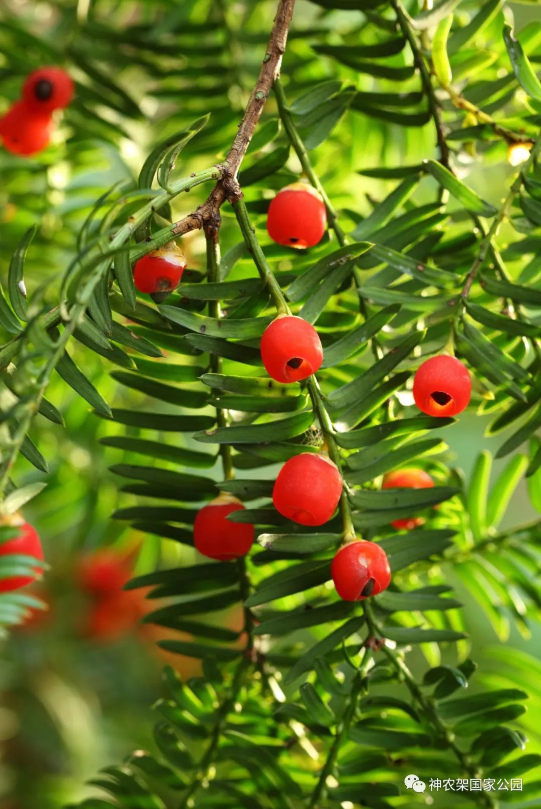 不不不,你可别被红豆杉之“杉”字误导了。这里说的杉类是指旧分类系统中的杉科,红豆杉则是红豆杉科红豆杉属的统称。由于红豆杉属的叶形似常见的杉树,百姓取名时便给它们安了个后缀“杉”,而“红豆”则是对这类植物的种子最直观的概括。远观“果”期的红豆杉,一颗颗鲜红、光滑的圆球状种子散乱地出没在叶丛间,与翠绿羽状的“杉叶”交相辉映,好不秀丽!若走近察看,就会发现“红豆”之所以红,是因为种子穿着一件红豆杉科特制的纯红色“睡裙”——酒桶状的肉质肥厚的假种皮。“假”是相对“种子自带的种皮”而言,意思是用以制作假种皮的原始材料并非生产种子的素材。假种皮所包裹的褐色光溜溜的坚硬小球才是红豆杉真正的种子。