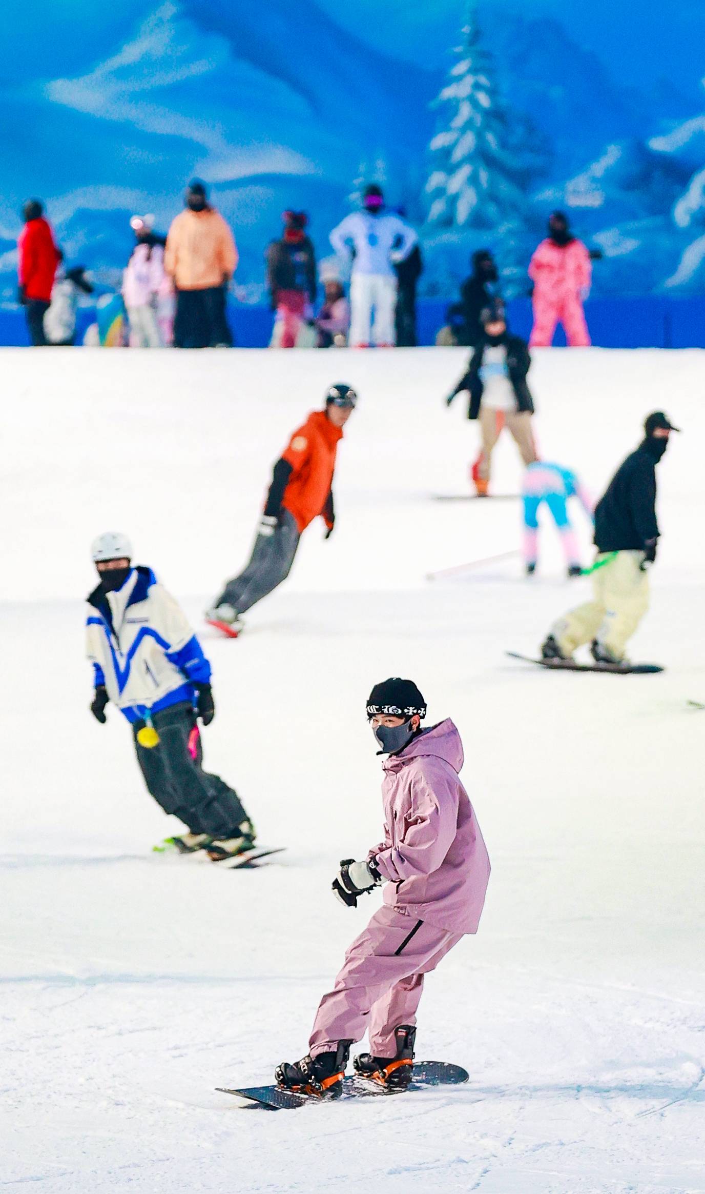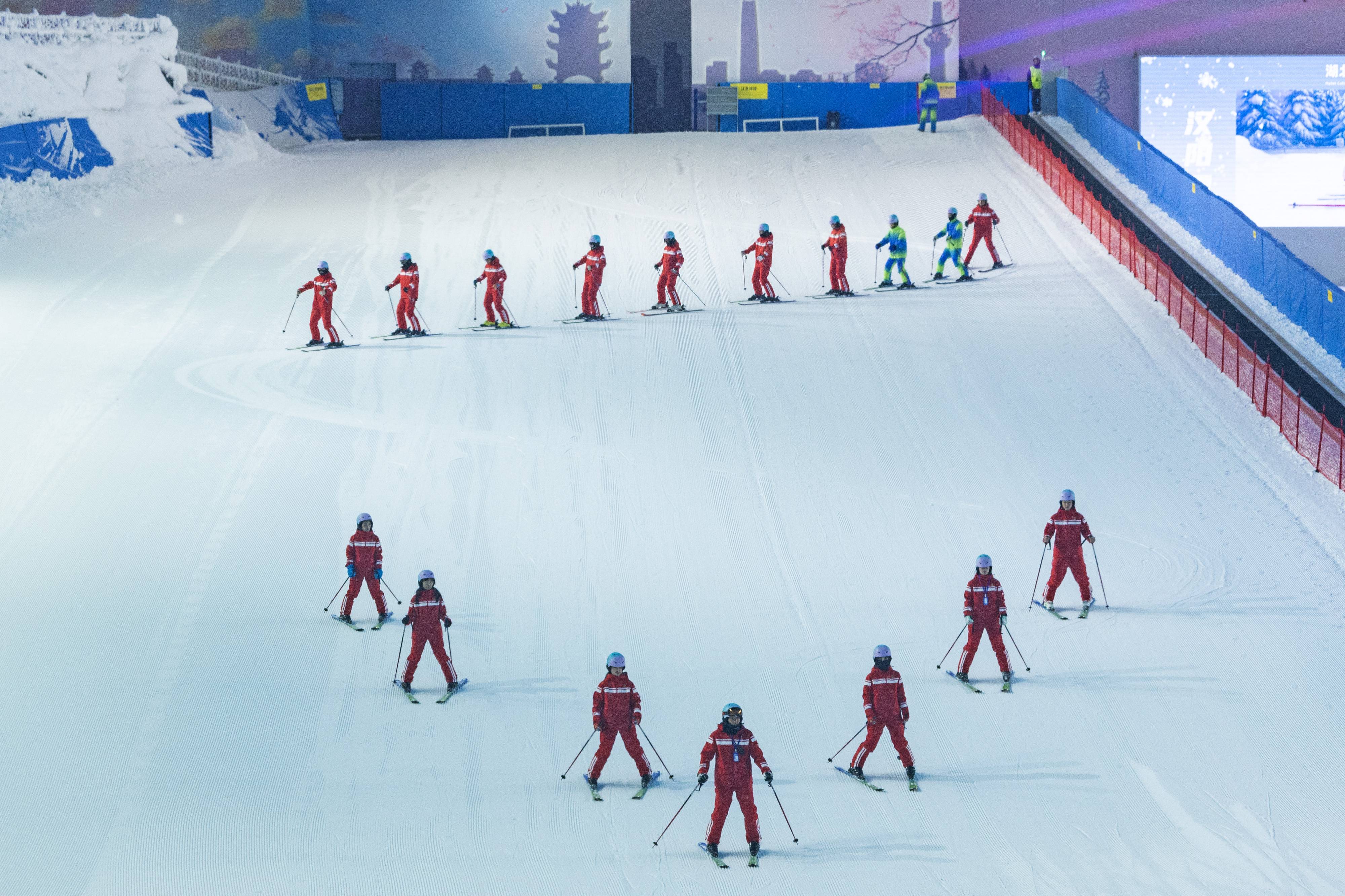 武汉冰雪中心地址位于武汉市汉阳区四新生态新城核心,一线临方岛湿地公园、地铁12号线正地铁口,项目建筑面积为3.1万平方米,比4个标准足球场还要大,是武汉中心城区最大的室内滑雪综合体。(湖北日报全媒记者任勇 摄)