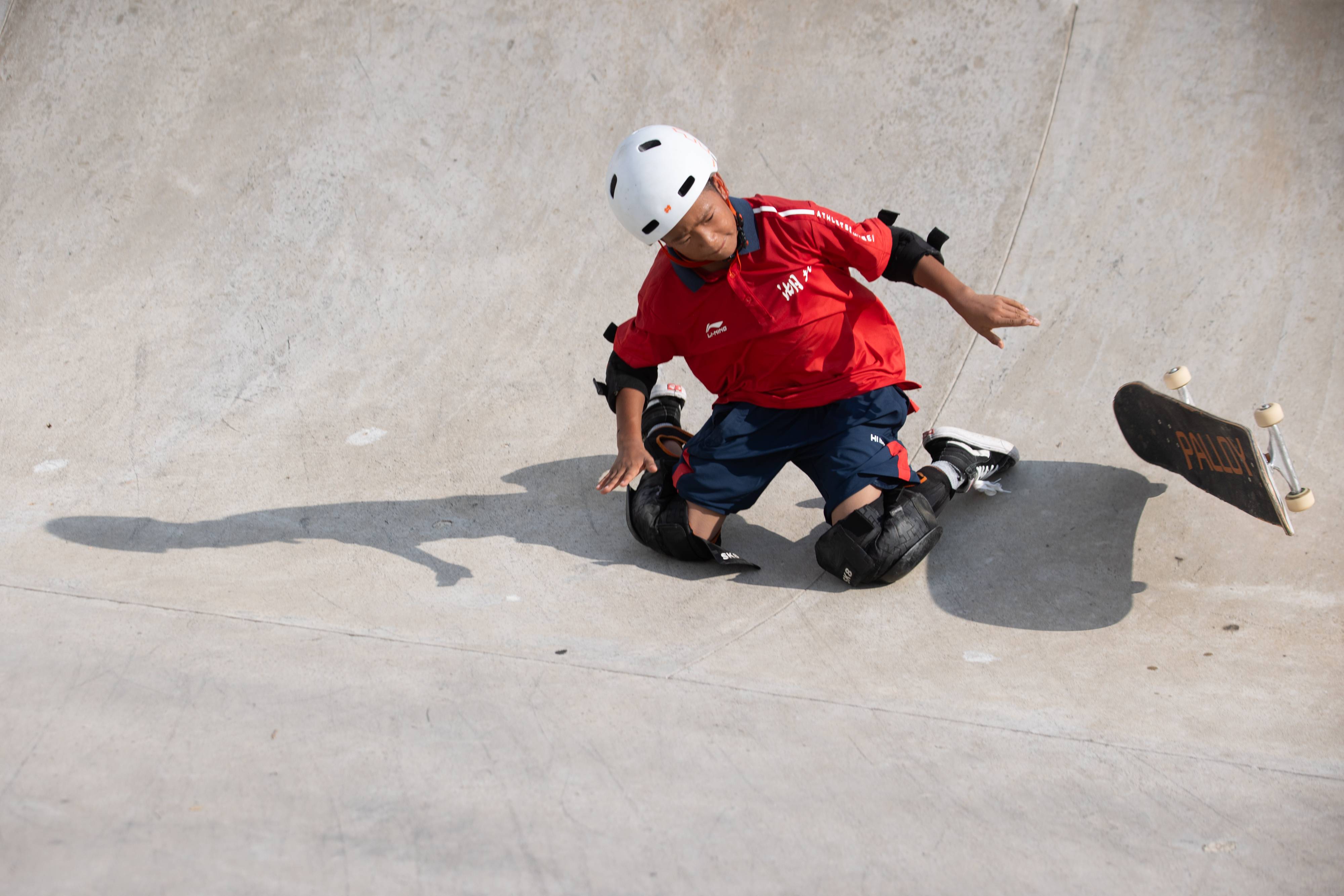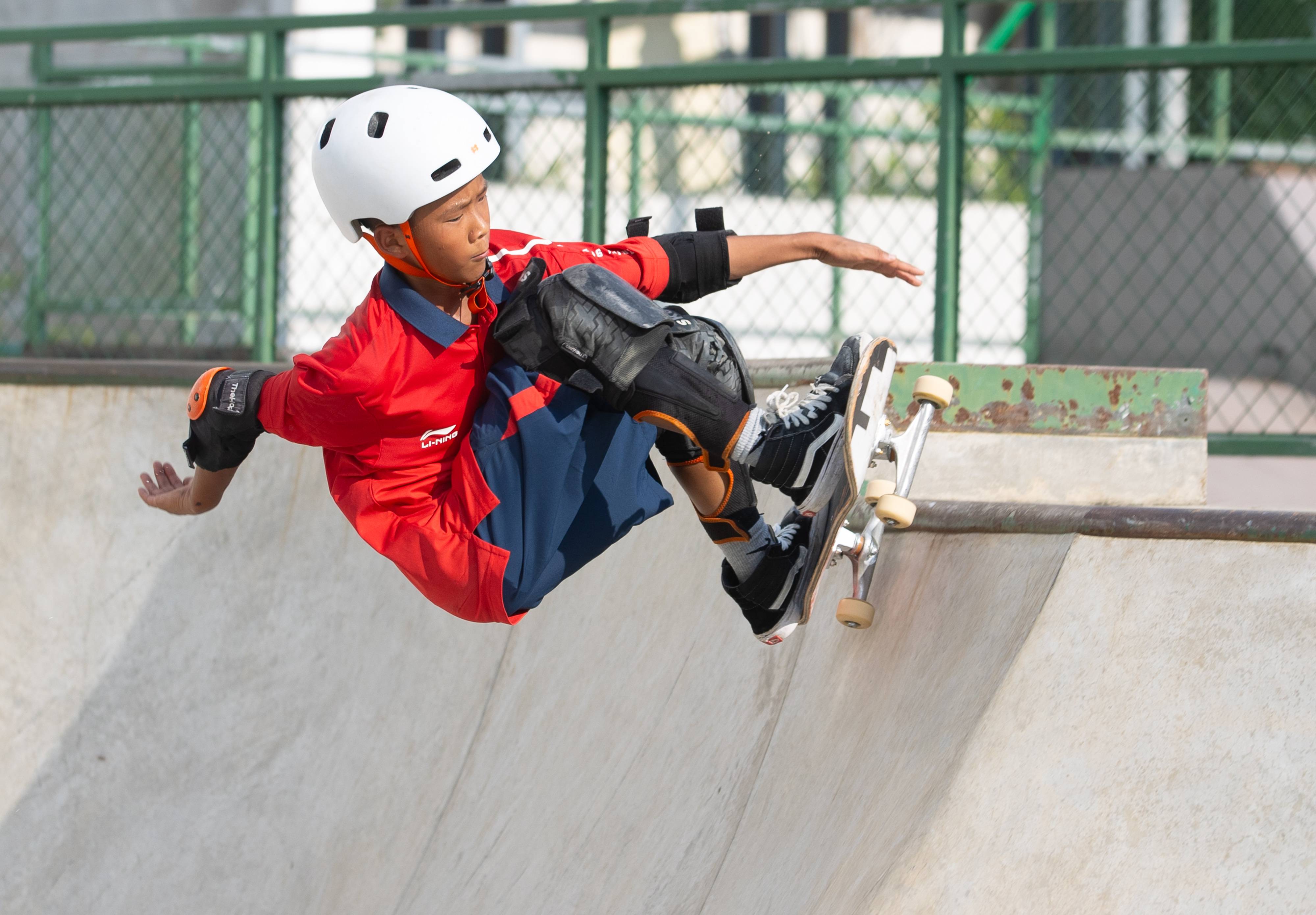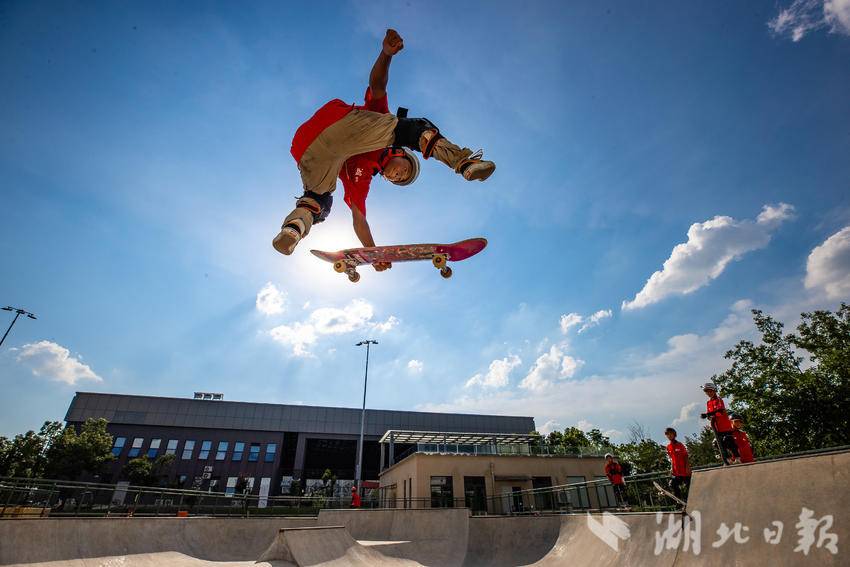 8月6日,烈日当空,湖北省滑板队的小队员们在碗池场地里刻苦训练。他们在场地里时而腾跃、时而转体,不停地挑战各种高难度动作。他们在训练场上挥洒汗水,只为追逐心中的冠军梦。(湖北日报全媒记者柯皓 摄)