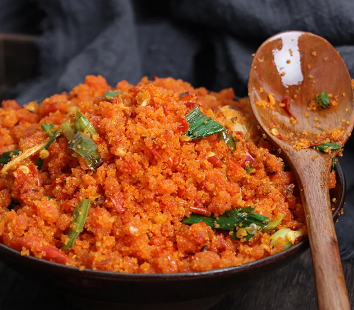 恩施土家族苗族自治州境内的土家人特别酷爱酸辣。有“三日不吃酸和辣,心里就象猫儿抓”的民谚,鲊广椒正是在这样的背景下发明的,并在恩施这块土地上长盛不衰。鲊广椒,也称为鲊辣椒,它是以恩施本地鲜红辣椒和苞谷面(玉米面)为主要原料加工而成。具体制作是:将鲜红辣椒去蒂洗净,沥干水分,用铡刀剁成细沫,加入食盐拌匀,再加入苞谷面拌匀(也有的还拌入花椒、桔皮等调料的)。盛入干净的坛子里,上面盖上菜叶,然后用竹片将其卡紧,再倒置于盆中,加入水(称为倒腹水)。优点是重力压住坛口,密封效果好,吸水有度,为无氧发酵提供了保障,使成品口味更醇更香。制作少量的鲊广椒也可用正腹水坛子,即有沿可放水的,正放,在沿内槽中放水,盖上盖,但这种坛子制作的鲊广椒不可存放太久,因为坛子内气压有可能将坛盖冲开进入空气,也可能吸水过多变稀走味。拌好的鲊广椒装坛后让其充分发酵,大约3周后就可取出烹制。一般是在锅中焙熟后与土家腊肉一起炒食或作扣碗底料蒸食,成品色泽微红,酸辣味十分特别。还有用鲊广椒做蒸肉、扣肉底料、伴料,这样做出来的蒸肉不油腻、爽口,易消化吸收。甚至用它与苞谷面做成苞谷糊喝的,叫鲊广椒糊。在选用辣椒时,最好用农历白露以后的辣椒,做出的味才好,否则就会太酸。苞谷面最好用恩施的小子黄苞谷。除了用苞谷面外,也有少数用糯米粉的。鲊广椒装入坛中后,一定要保证盆中有水,密封性好的可保存几年不变质。