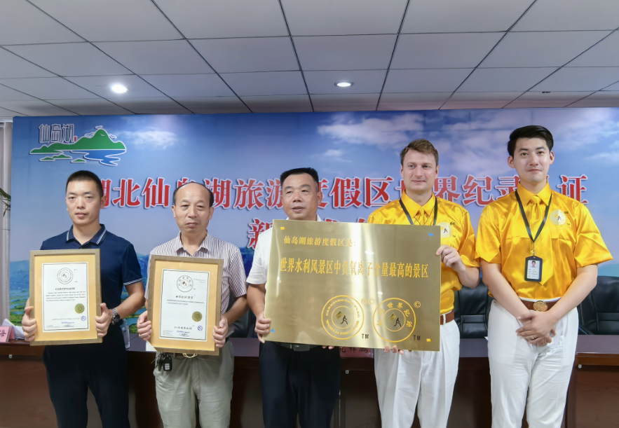 发布会上,来自英国扛旗世界纪录官方认证机构的认证官宣布认证结果,并现场颁发《世界水利风景区中负氧离子含量最高的景区》纪录证书。