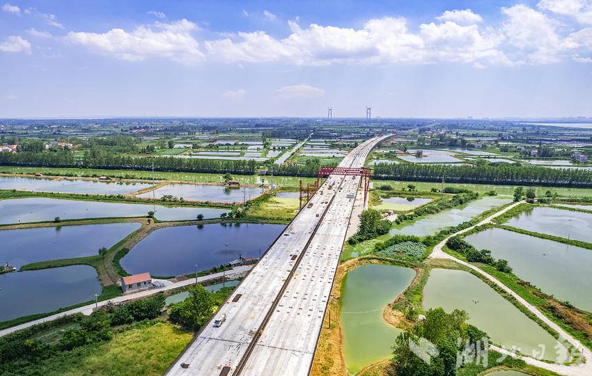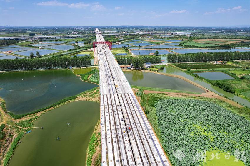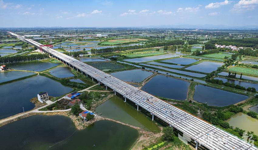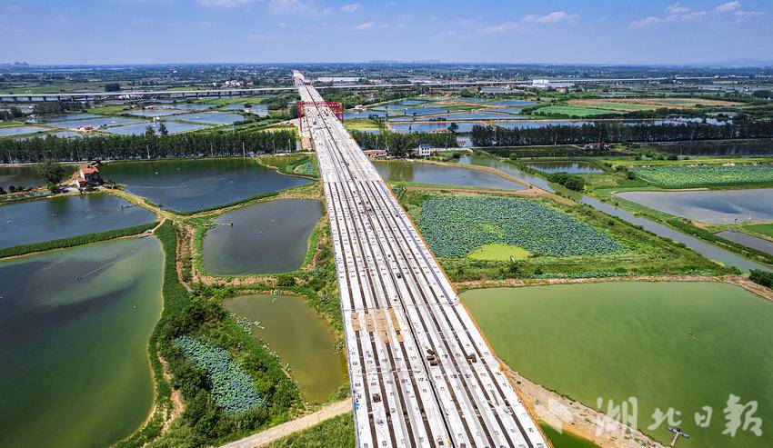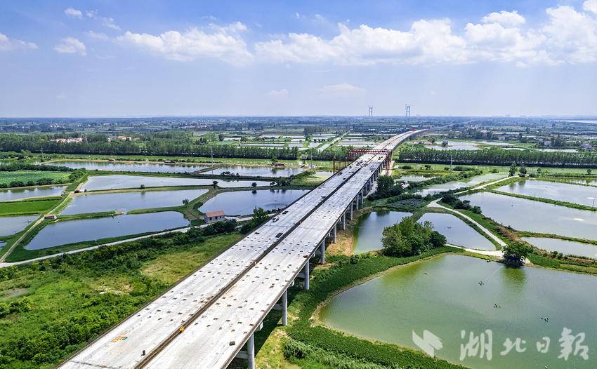 8月5日,鸟瞰新港高速双柳长江大桥XGTJ-2标项目,本标段施工范围内涉及6.6公里的武汉市新洲区涨渡湖湿地保护区,目前,穿越涨渡湖湿地的双柳长江大桥接线桥部分桥面已贯通。
