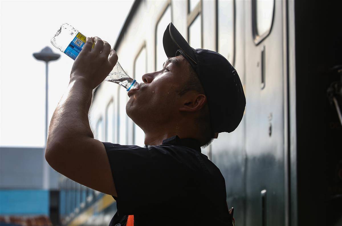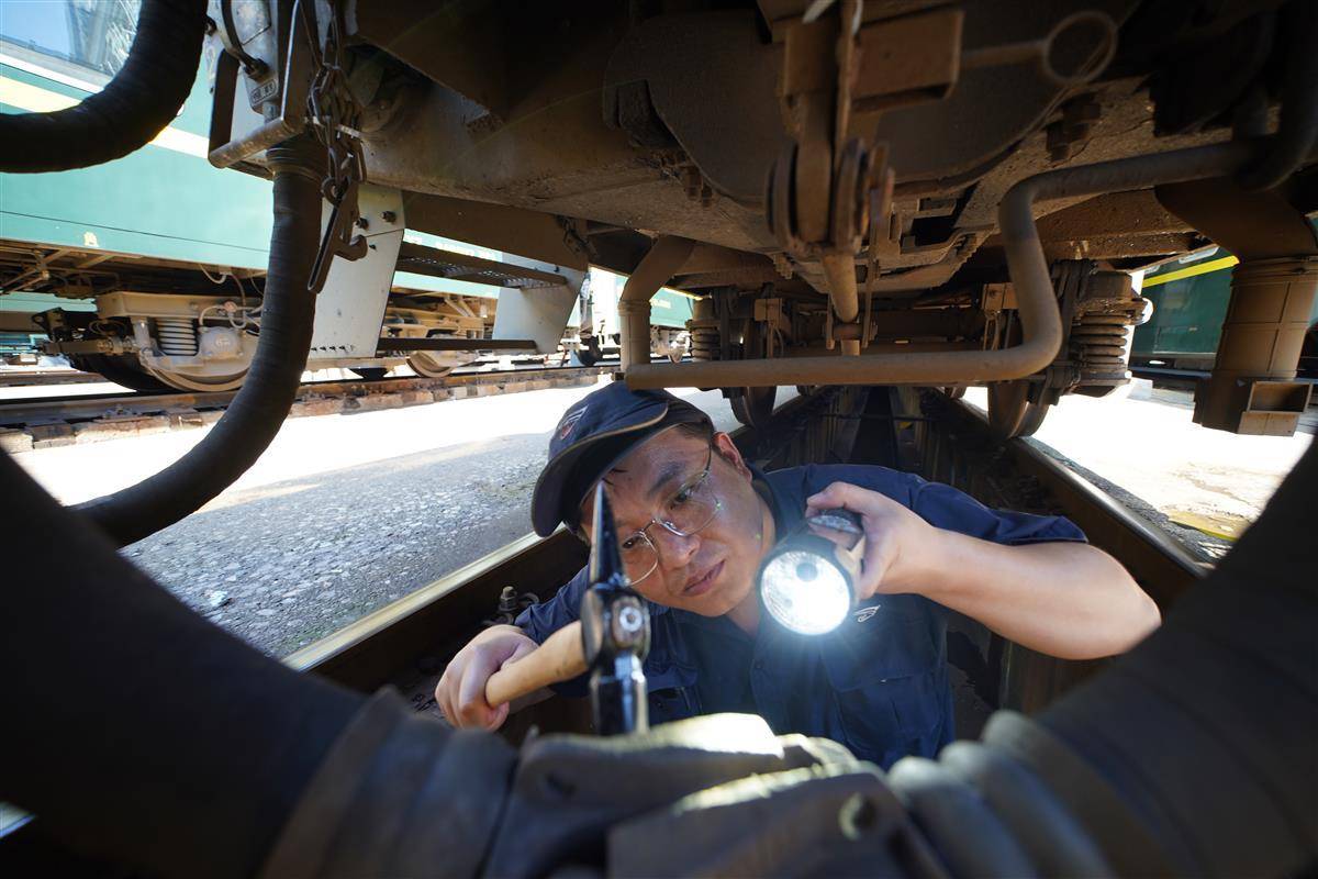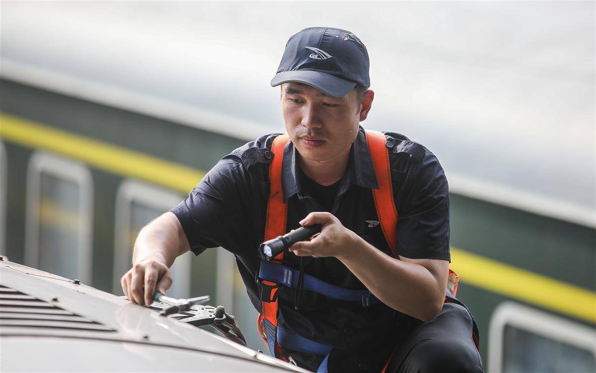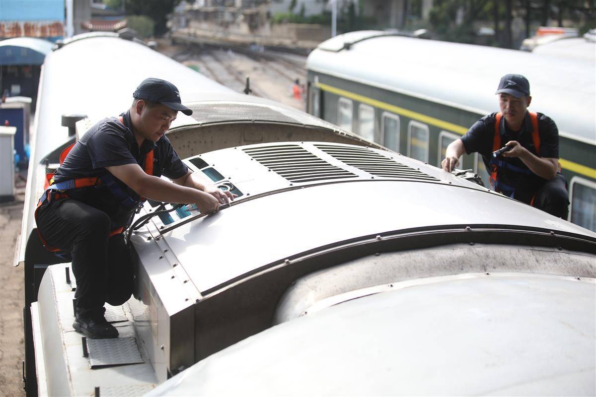 8月9日下午3点,武昌客车车辆段地面热浪滚滚,检车员紧张忙碌地为列车“体检”。近日,武汉连发高温红色预警,为确保列车安全开行,该段组织技术骨干加强空调机组、座椅、电茶炉等上部服务设施检修力度,让旅客清凉舒适出行。