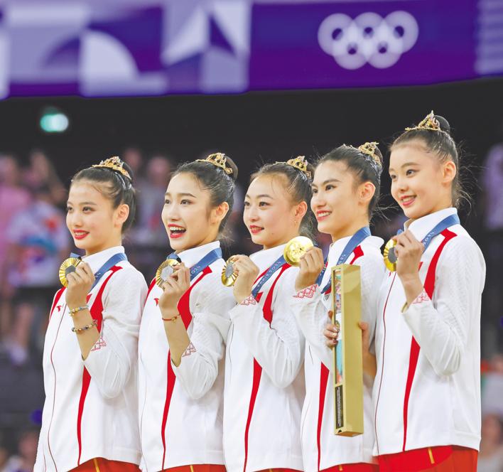中国艺术体操队 艺术体操团体全能 第三十五金 北京时间8月10日,巴黎奥运会艺术体操团体全能决赛在拉夏贝尔门体育馆进行。由郭崎琪、郝婷、黄张嘉洋、王澜静和丁欣怡组成的中国队,以总分69.800分的成绩首夺该项目奥运金牌。 (新华社发)