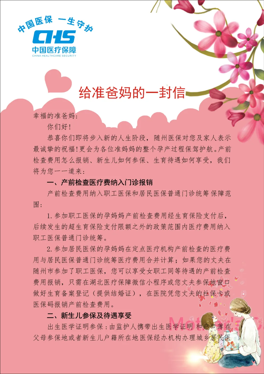 恭喜你们即将步入新的人生阶段,随州医保对您及家人表示最诚挚的祝福!更会为各位准妈妈的整个孕产过程保驾护航。产前检查费用怎么报销、新生儿如何参保、生育待遇如何享受,我们将为您一一道来: