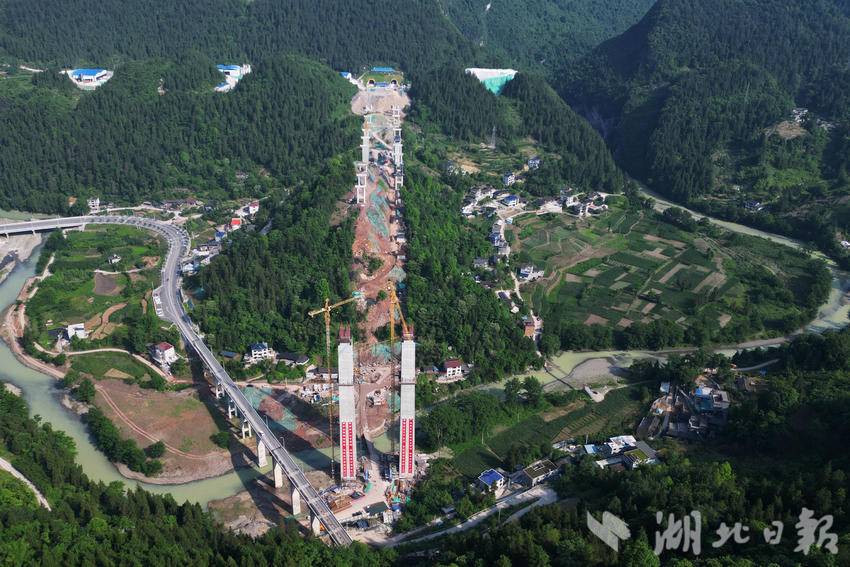 湖北日报客户端讯(通讯员李维君、周制江)8月上旬,咸丰县唐崖镇南河上,利咸高速黄河坝特大桥15号墩高耸入云,与毗邻的463省道玄武大桥相互映衬,成为南河一道亮丽的风景线。