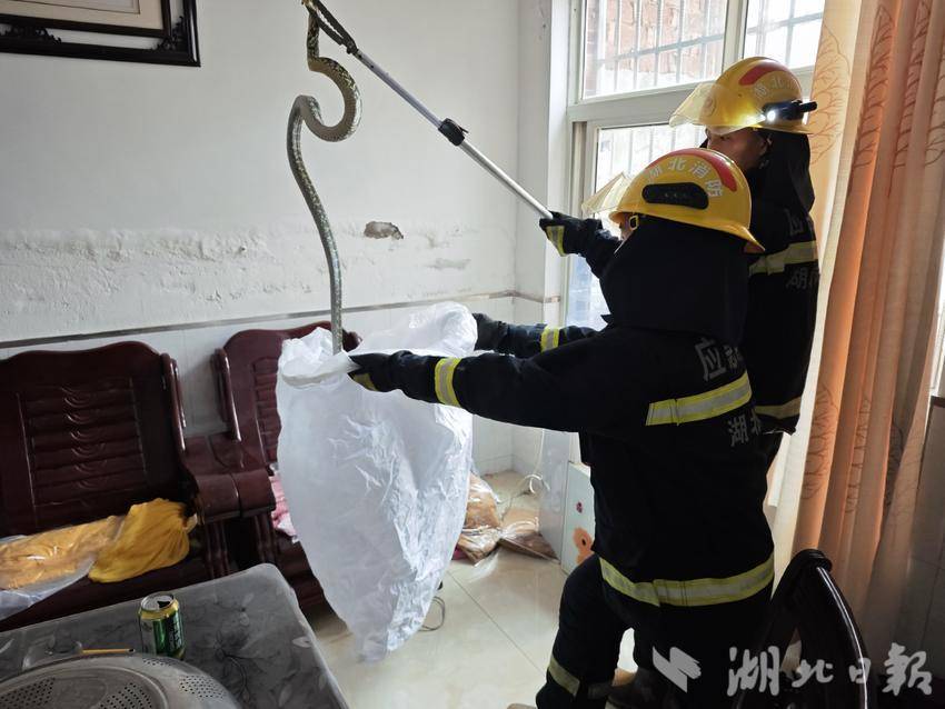 湖北日报客户端讯(通讯员 刘锦成 卢畅)2024年8月13日下午4点58分,黄梅县消防救援大队接到报警电话称,在辖区的小池精品北街701号,有一条两米长的菜花蛇跑进了居民楼,给居民们带来了极大的恐慌。这条蛇的出现,让居民们感到非常害怕,他们不知道该如何处理这种情况。
