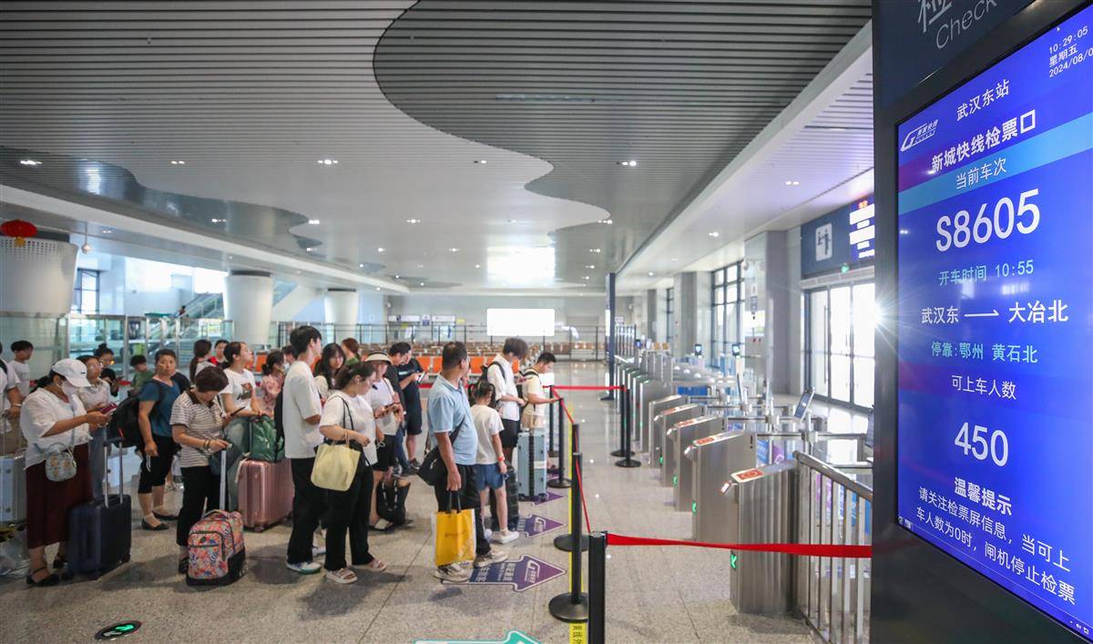 8月9日,乘客在武汉东站排队候车,准备乘坐新城快线S8605次列车前往大冶北站。