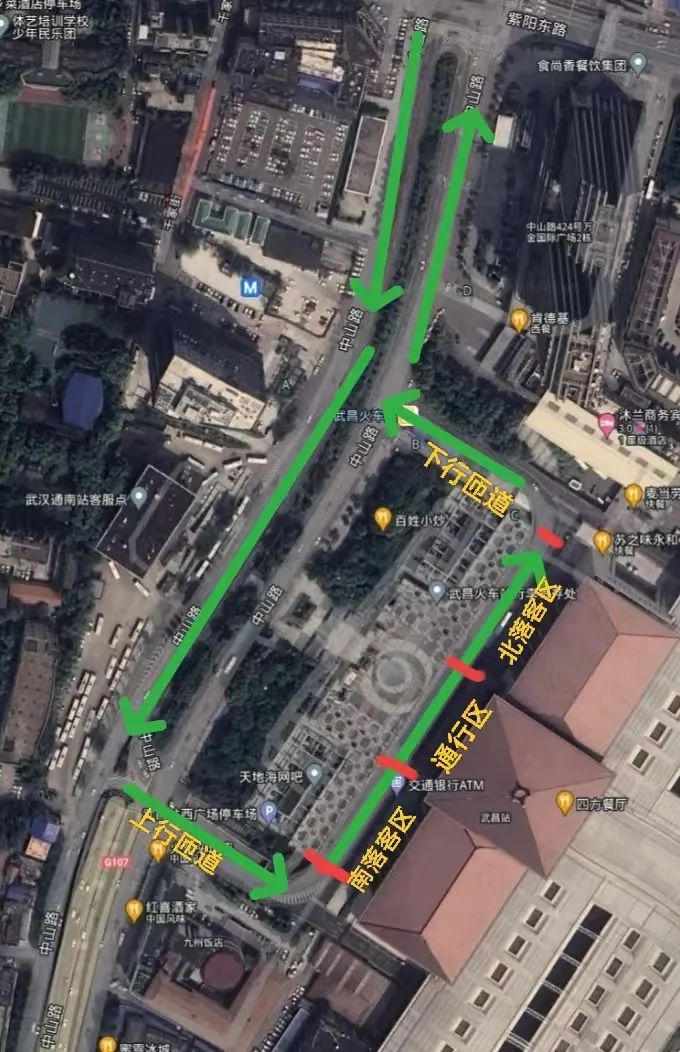 送客进站车辆经中山路,由中山路与武昌火车站车行平台上行匝道驶入(限停5分钟交通标识、电子眼起点),驶至车行平台南、北落客区停车落客,由车行平台下行匝道驶离(电子眼终点),汇入中山路。