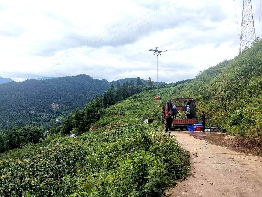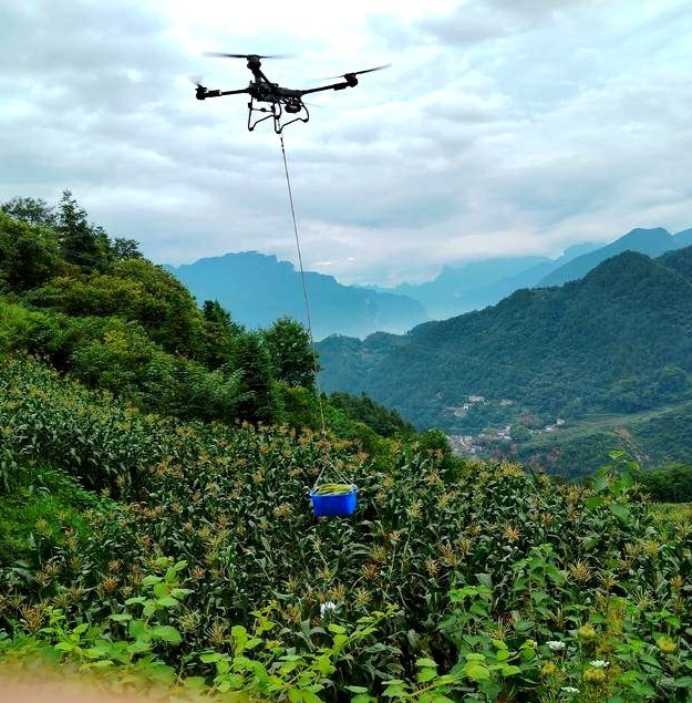 7月19日,秭归县归州镇白果园山上,一架大型无人机在田间上空运输甜玉米。