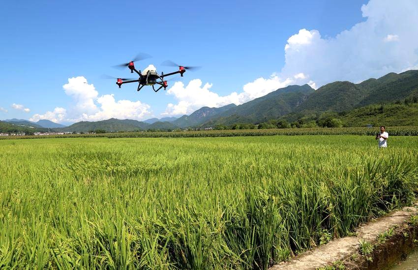 近日,农技人员在保康县马良镇潮水村通过无人机为水稻喷洒农药防治“两迁”害虫。