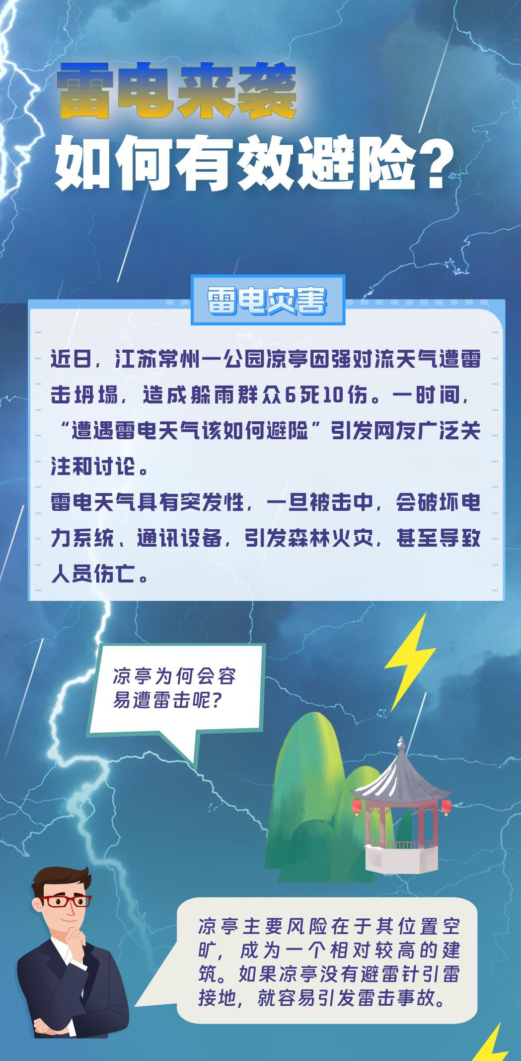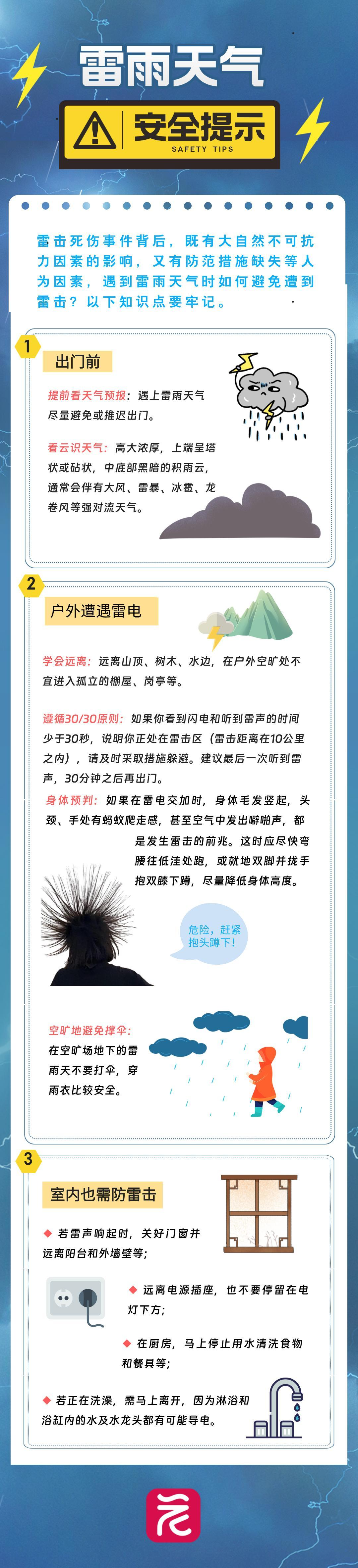 雷电具有高电压、大电流、强电磁辐射等特征,主要表现形式为闪电,一旦被击中,会造成严重的危害和经济损失。近年来,雷击死伤事件时有发生。这其中既有大自然不可抗力因素的影响,又有防范措施缺失等人为因素,如何避免遭到雷击?一图了解如何正确防雷。