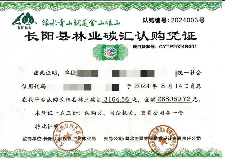 经宜昌中院组织调解,双方当事人就认购碳汇达成一致意见,签订调解协议,被告某公司自愿购买长阳林业碳票履行生态损害赔偿责任,认购金额288069.72元,认购碳汇量3164.56吨。