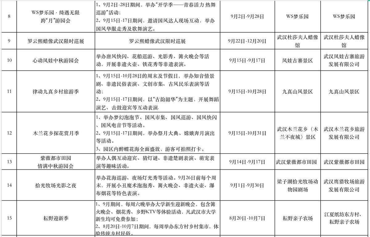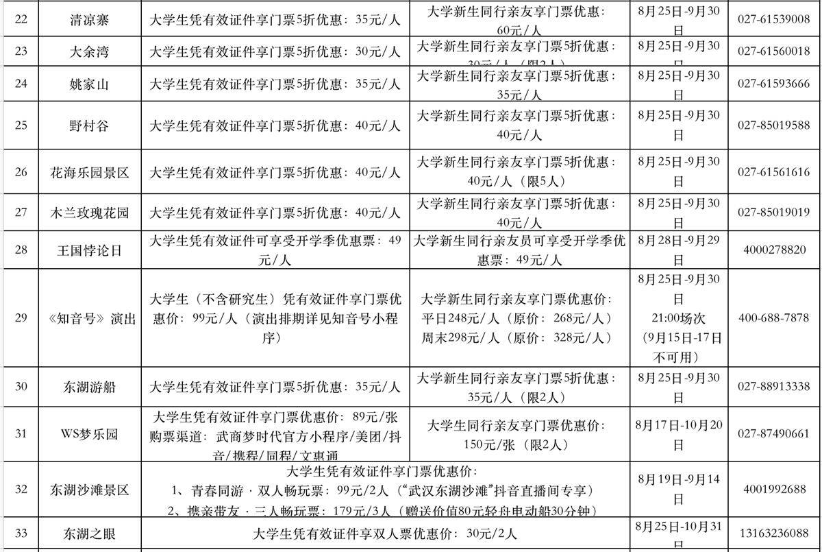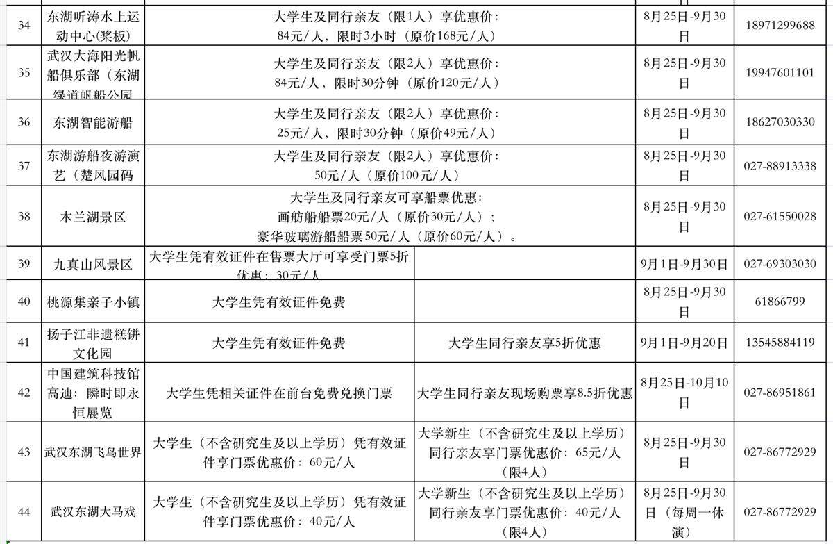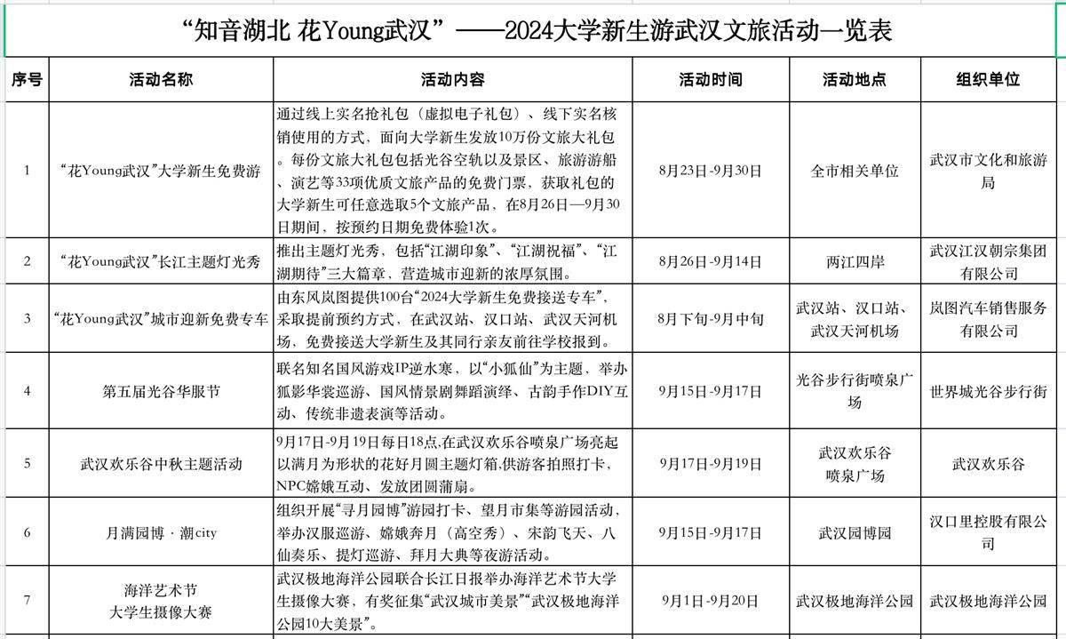 8月下旬至9月底,相关景区、商超、餐饮、住宿等企业和平台,针对大学新生及其亲友的系列优惠措施。比如,黄鹤楼、欢乐谷等40多家文旅企业推出5折专属优惠,部分景区(点)推出2.5折特价优惠甚至免票福利。市商务局开展“青春食光——百万大学生畅享名菜名点”活动,组织武汉地方特色餐饮企业面向大学新生推出江城“十大名菜、十大名点”打折优惠。