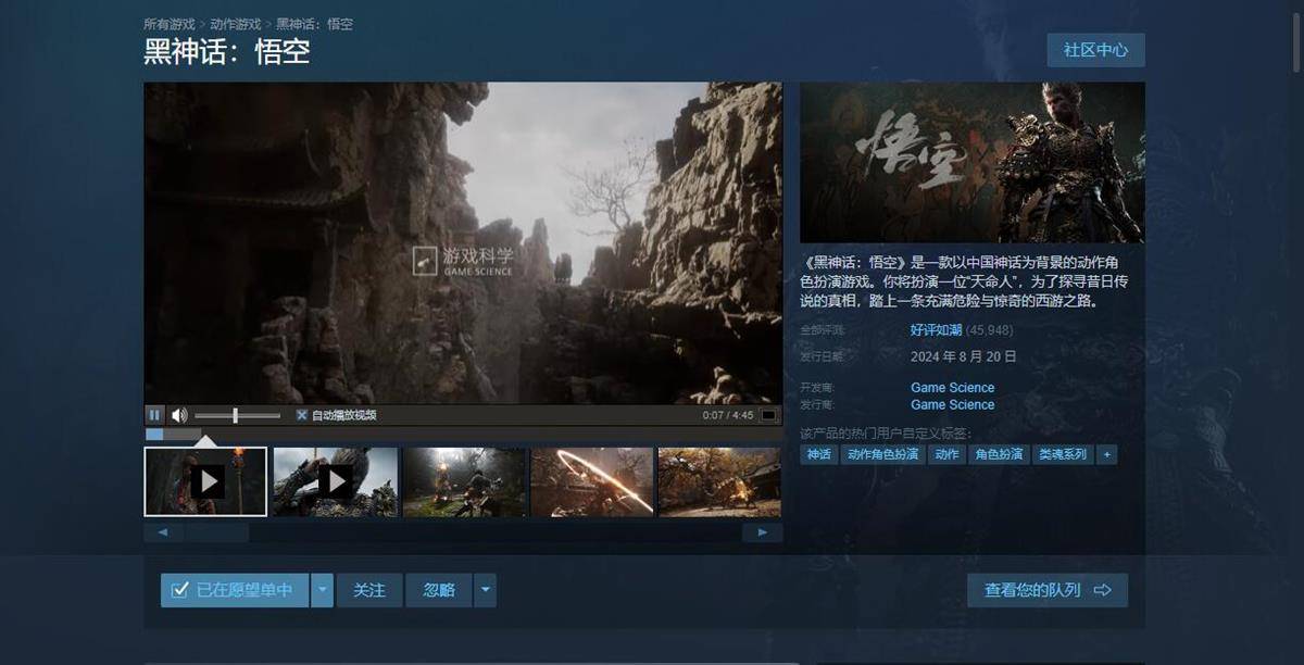 8月20日,国产游戏《黑神话:悟空》上午10时全球同步上线。截至晚上7时,该游戏在知名游戏平台“Steam”收获45949条用户评论,游戏测评显示“好评如潮”,好评率达到96%。(注:用户需购买268元基础版或328元数字豪华版才能取得测评资格)
