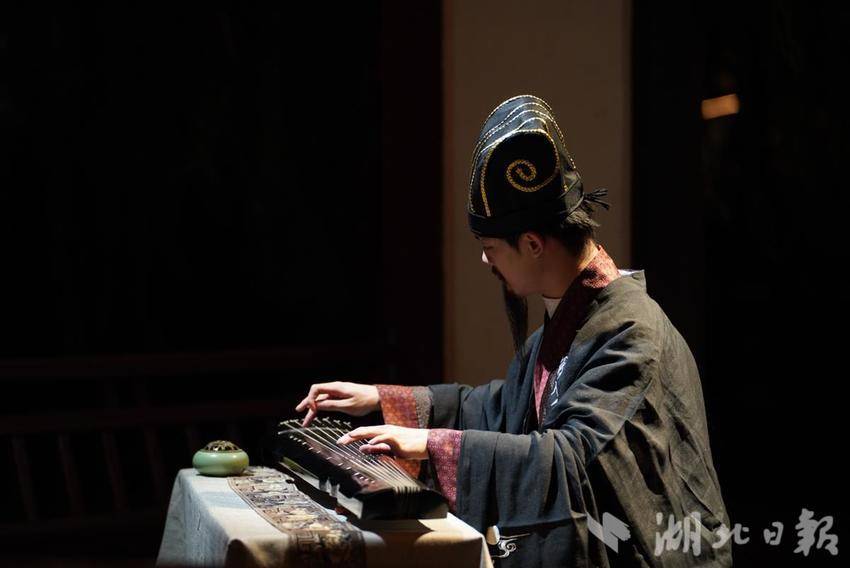 古琴铮铮,循声而去,只见鹅池凉亭内,演员扮演的“诸葛亮”身穿鹤氅头戴纶巾,凭栏而坐,高声昂曲。一曲《空城计》再现瑶琴三尺胜雄师的三国名段,风驰电掣,似乎百万大军逼近,战火一触即发。静心聆听,仿佛能够穿越时空,与那位卧龙先生进行一场心灵的交流。在琴声中感受历史的沧桑,更能体会到智者的深邃与超然。来自襄阳的王女士表示:“表演非常精彩,让人感觉身临其境,好想去和诸葛亮合个影。”