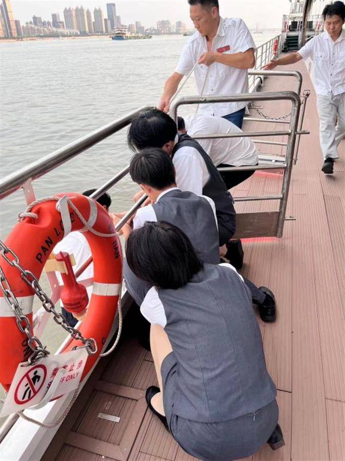 每逢暑期天热,江滩边常有市民戏水玩耍,意外落水情况偶有发生。作为“两江盘龙”号船员,胡堃及其他船员上岗前都接受过急救培训,包括急救设施使用、心肺复苏等内容,以便及时应对突发状况。“近几年我们曾遇到过几起落水事件,都有惊无险地救人上岸。”胡堃说,“同时,我们岸边引导员也会提醒大家在戏水消暑时注意安全。”