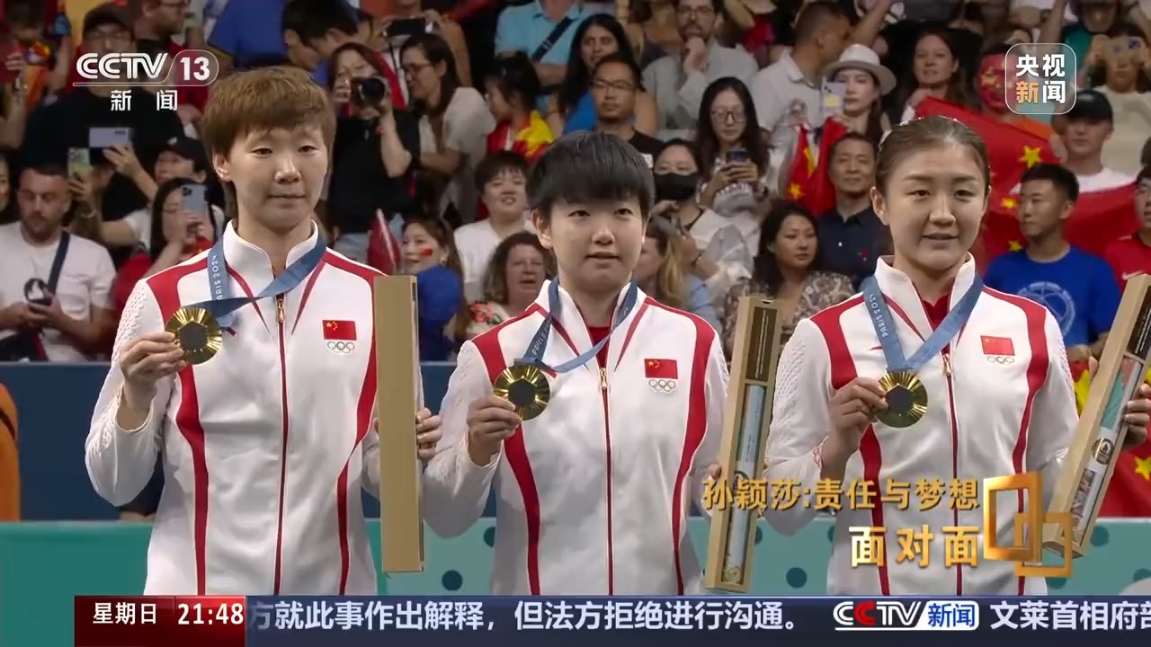孙颖莎:就是奥林匹克精神,更快更高更强,你不断去超越自己,然后成为一个榜样,然后树在这,可能会传递给以后的年轻运动员,他可能说想成为像孙颖莎一样的人。不管成绩如何,我觉得做到自己问心无愧,其实就很好。