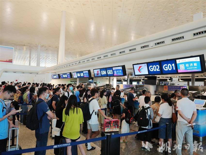 8月26日9时30分,武汉天河国际机场T3航站楼,进入航站楼、办理值机、等待安检都人潮涌动,交通枢纽的繁忙景象彰显这座城市的生机与活力。