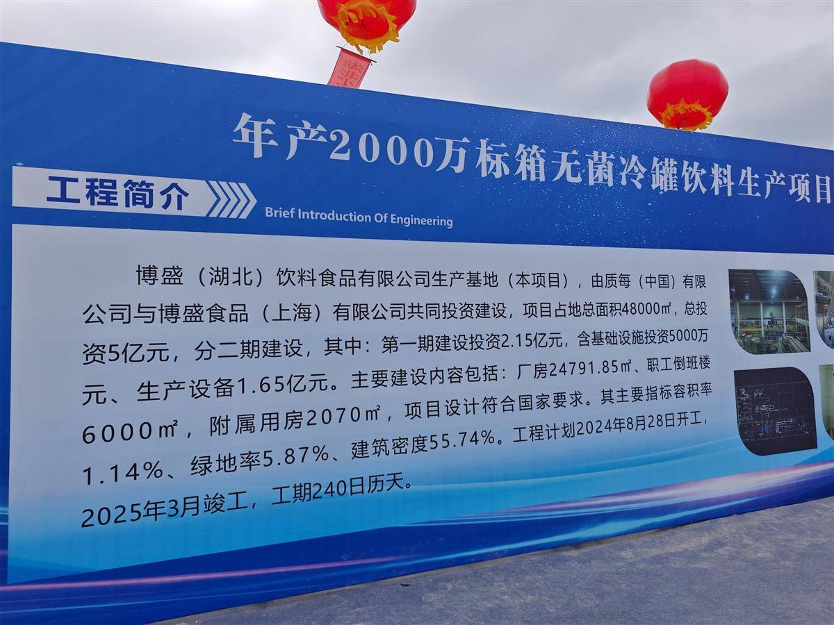 据了解,博盛(湖北)项目占地4.7万平方米,厂房面积2.8万平米, 总投资超过5亿元以上,一期实际投资2.15亿元以上;项目将引进德国最先进的全自动高速无菌冷灌生产线,可年产2000万标箱的无菌冷罐装饮料,目前,同等配置设备在华中地区智能化程度最高,填补了地区市场空白。第一期项目建成后,年产值可达5亿元以上,实现利税5000万元以上,项目预计2025年5月底之前正式投产运营并满负荷生产。