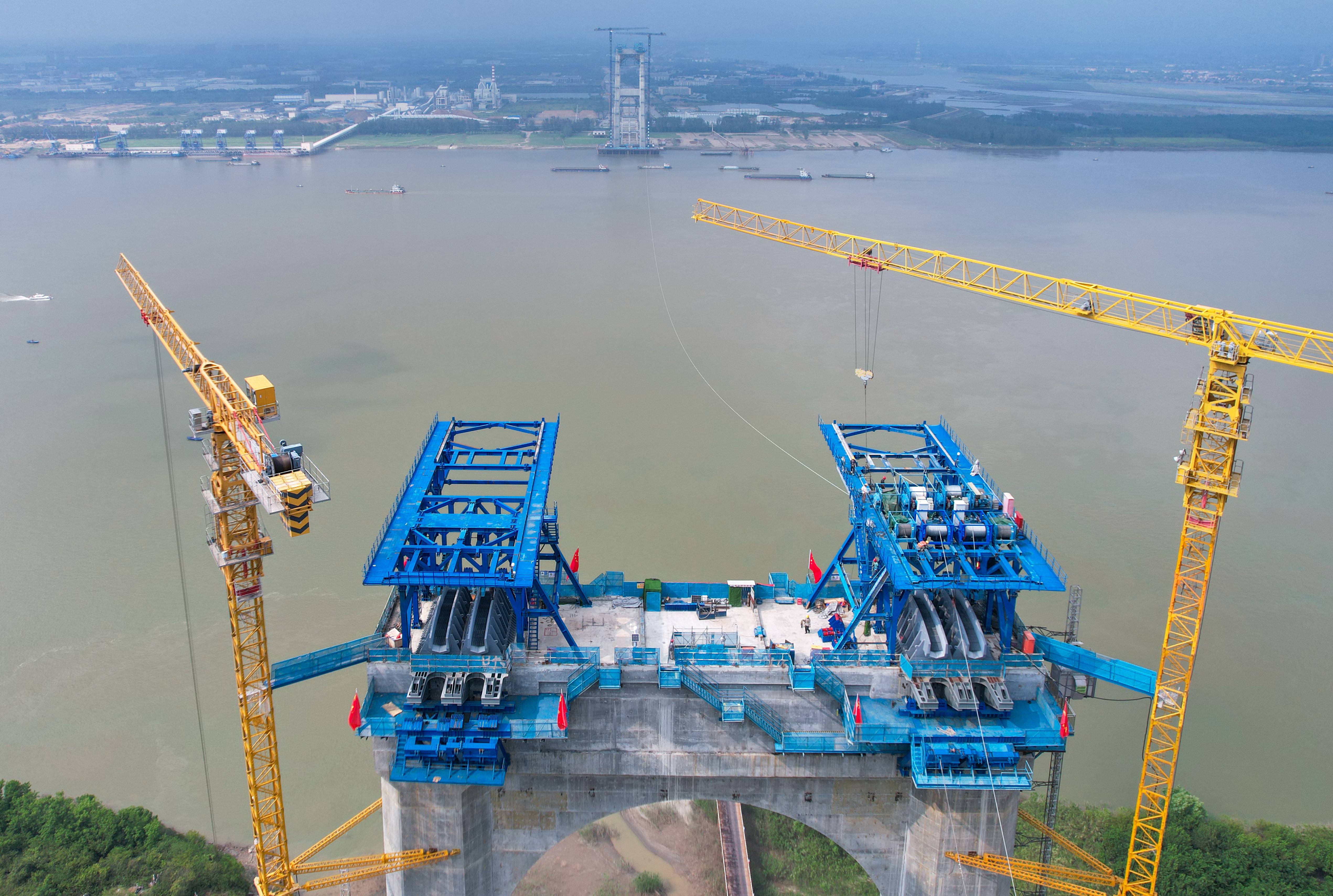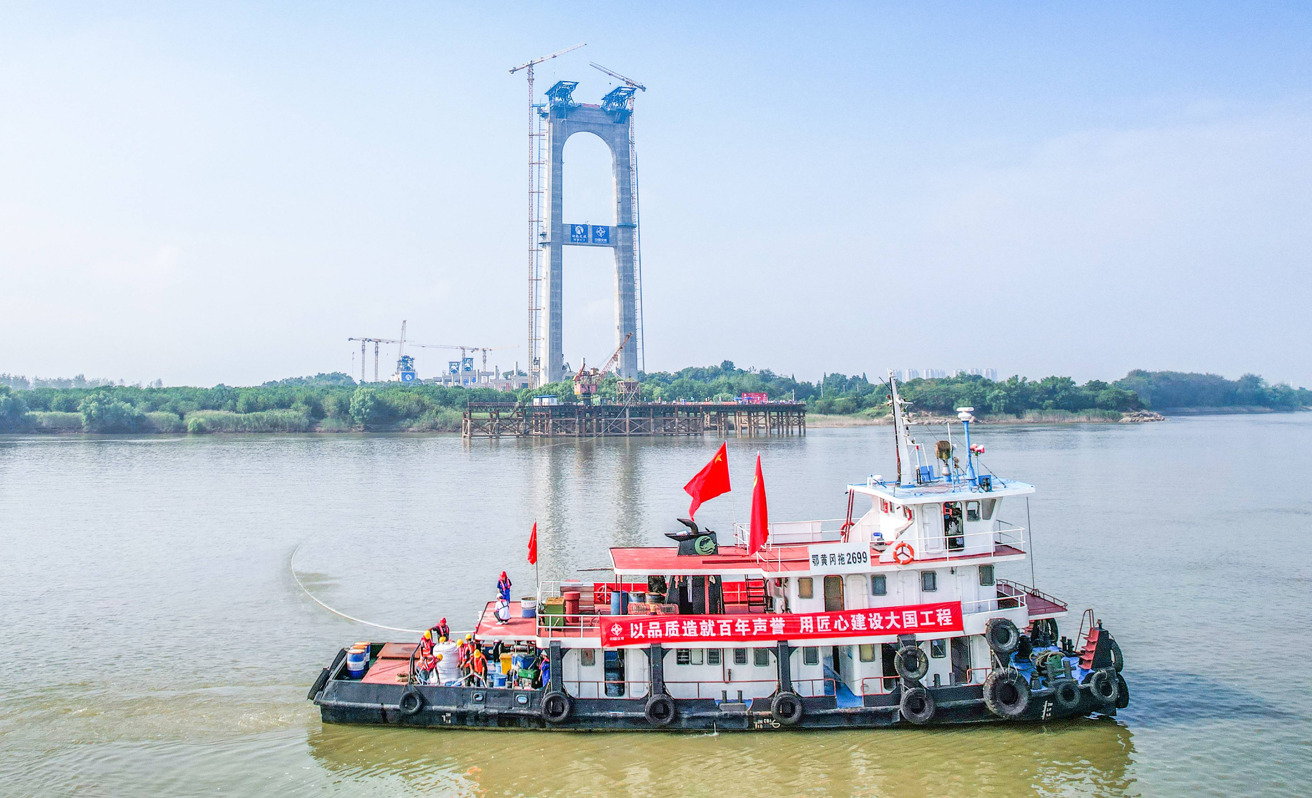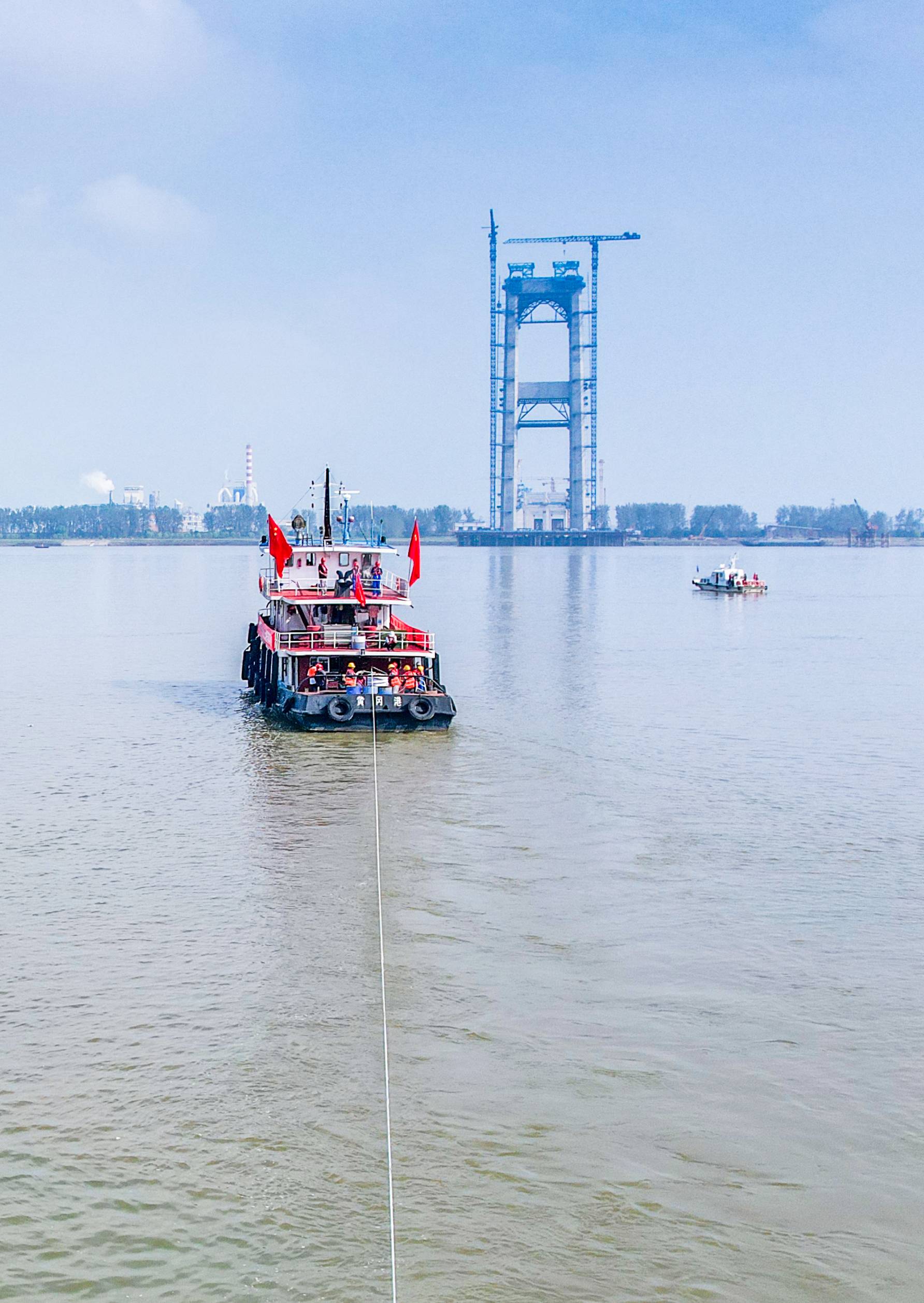 8月29日,由湖北交投投资建设、中交二航局承建的湖北省燕矶长江大桥成功跨越1860米江面,完成先导索的架设,南北双塔顺利实现“会师”。(湖北日报全媒记者 柯皓 通讯员 向昌文 摄)