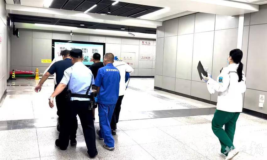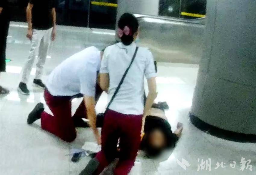 武汉地铁11号线未来三路站工作人员黄贝贝回忆说,“我正在接车时,突然听到身后‘咚’的一声响,转过身来时,只看到一乘客已经后仰倒地,全身抽搐。”黄贝贝立即上前,见乘客脸色呈紫绀色、口吐白沫,马上报告值班站长,同时拍打肩部呼唤乘客。