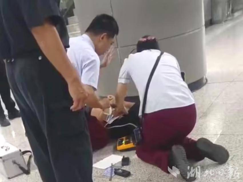湖北日报讯(记者成熔兴、通讯员李丹、产启斗、何其凤)8月28日晚6时许,一名男乘客进入武汉地铁11号线未来三路站时,突发疾病倒地,心跳呼吸全无。现场工作人员利用AED,在急救120的远程指导下,进行了持续6分钟的心肺复苏急救,夺回了乘客生命。