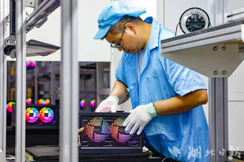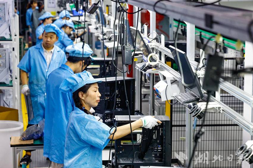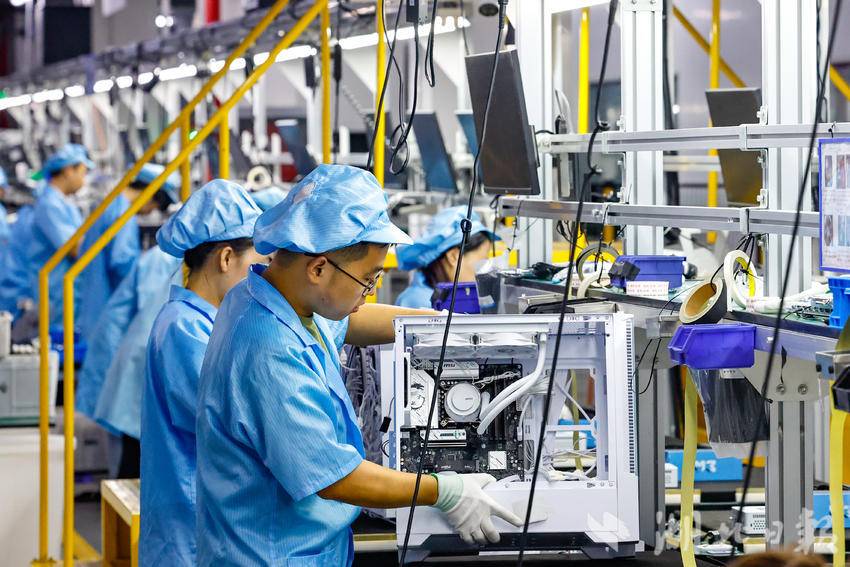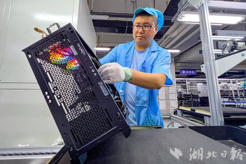 8月30日,在武汉黄陂滠口攀升科技园电脑组装生产线上,工人们正抓紧生产。据了解,新款游戏上线后,不少游戏玩家积极升级电脑装备,攀升电脑近期销售额环比增长超过40%,部分高端定制产品销售异常火爆。近日,首个国产3A游戏《黑神话:悟空》正式上线,成为全球游戏玩家的焦点。电脑、PS5、显卡等数码产品销售迎来大涨。(湖北日报全媒记者倪娜通讯员单瓅摄)