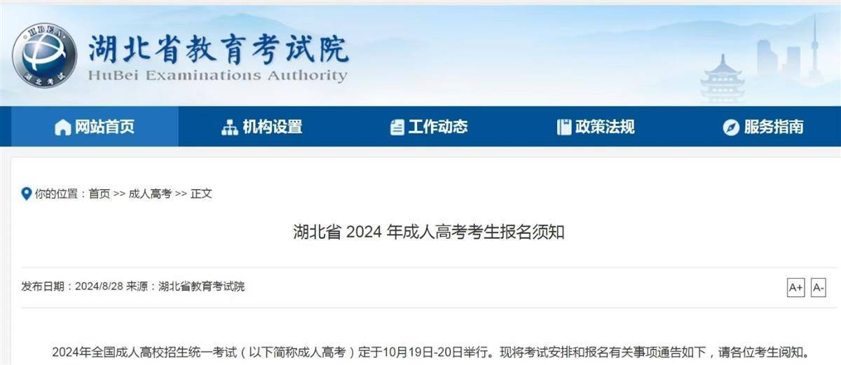 湖北日报讯(记者方琳、通讯员沈考)从湖北省教育考试院获悉,2024年全国成人高校招生统一考试(简称成人高考)定于10月19日-20日举行。报名即将开始,请广大考生关注相关信息。