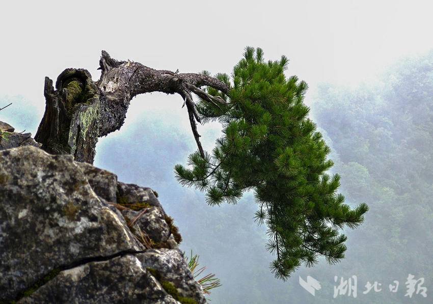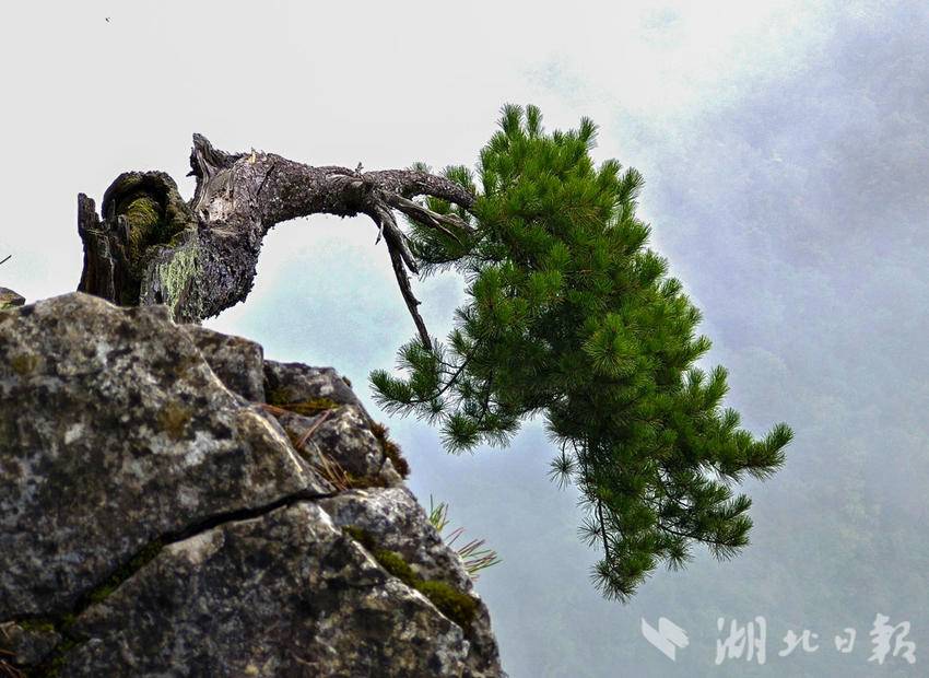 湖北日报客户端讯(通讯员程平、陈波、杜登艳)8月28日,湖北堵河源国家级自然保护区洪坪管理站站长袁孝文在保护区境内的竹山县柳林乡洪坪村刀儿山巡护监测时,惊喜地发现一株“孤独”的虬枝松树,傲然挺立在海拔2300米的悬崖绝壁之巅,于是就拍下了这棵媲美“竹山版迎客松”的奇观。